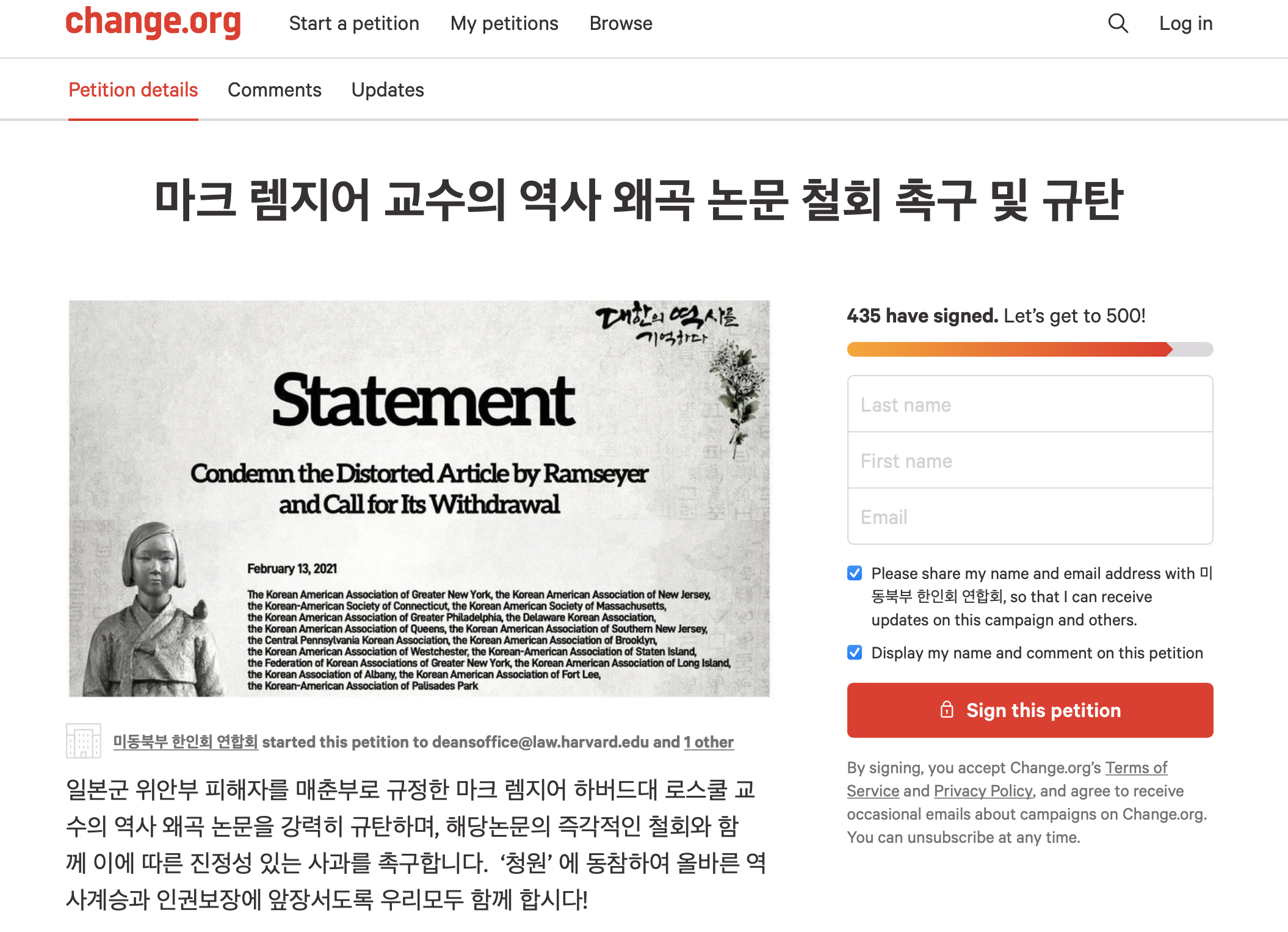 사이버외교사절단인 반크에서는 세계 최대 규모 청원사이트인 '체인지닷오알지(change.org)'에 램지어 교수의 논문을 철회할것을 요청하는 청원을 올렸고 96개국 1만 600여명의 서명을 받아 하버드대 측에 보내기도 했습니다.