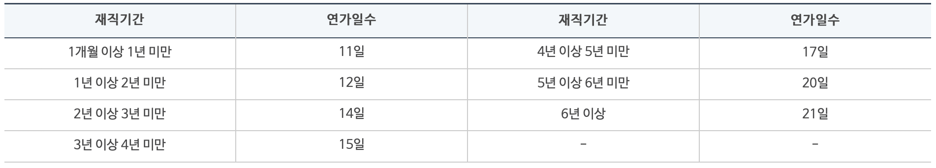 재직기간에 따라 최소 11일부터 최대 21일까지 사용가능합니다.
