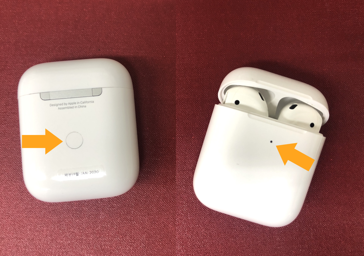 그럼 에어팟 앞 부분의 불빛이 흰색이 약 10회 이상, 주황색 불이 2회 이상 꺼졌다 켜졌다를 반복하면