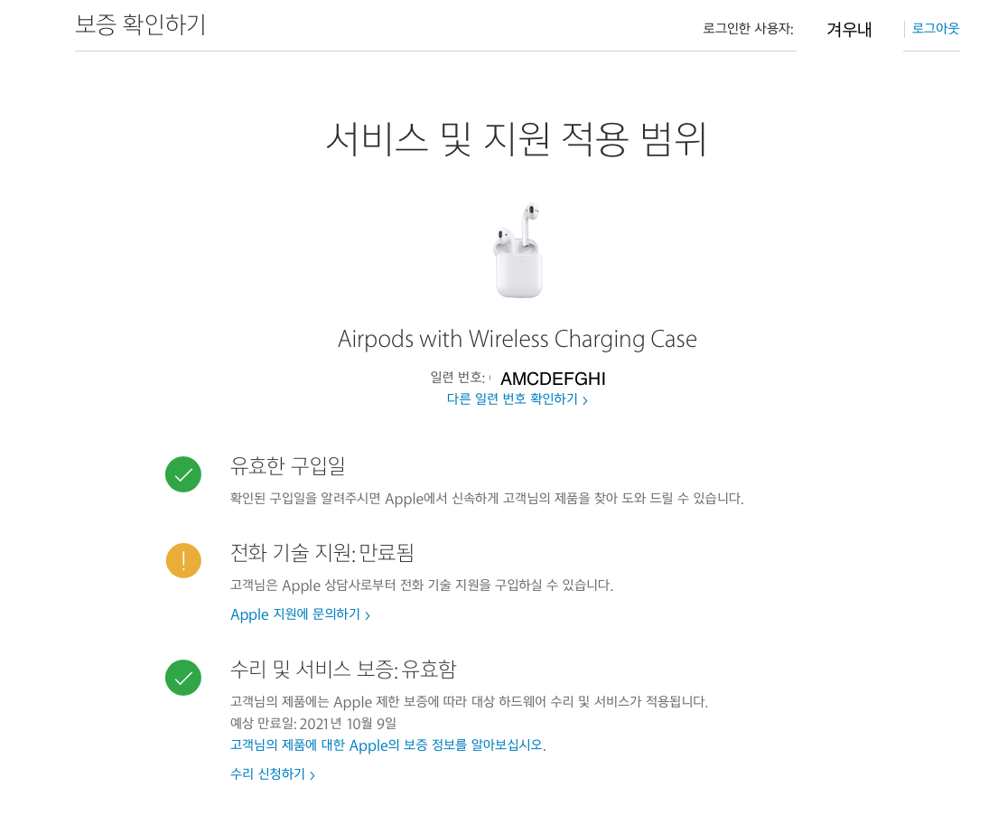 입력된 에어팟이 서비스 지원 적용범위에 들어가는지 확인을 해줍니다.