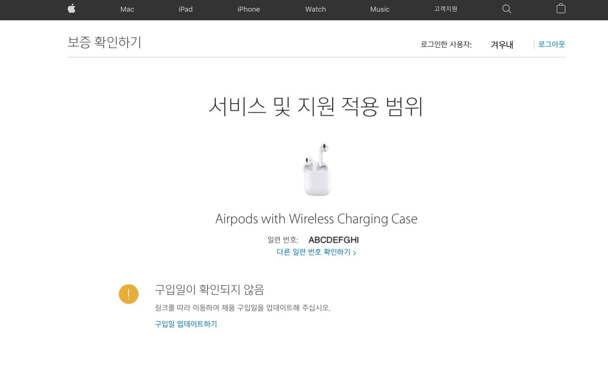 제 에어팟은 구입일이 입력되어 있지 않아 '구입일이 확인되지 않음' 으로 검색이 됩니다.