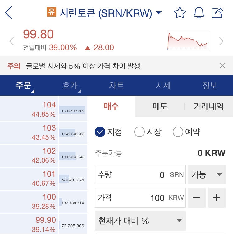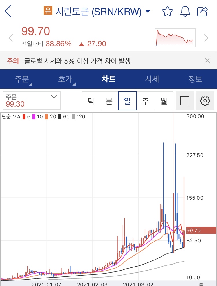 현재 업비트 시린토큰 홈페이에도 글로벌 시세와 5% 이상 가격차이가 난다고 주의표시가 떠 있습니다.