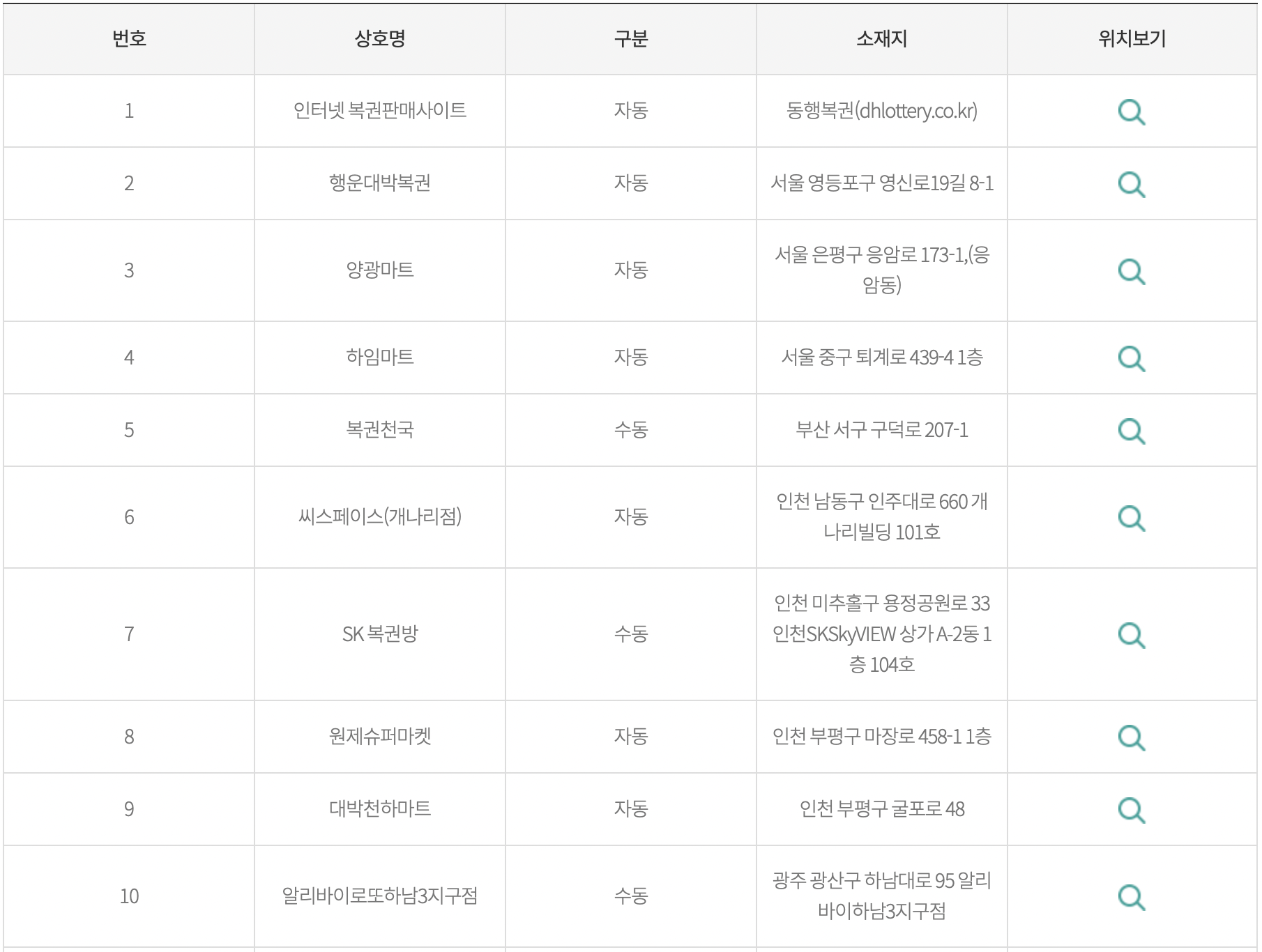 인터넷 동행복권에서 1곳, 서울 3곳, 부산 1곳, 인천 4곳, 광주 1곳, 울산 1곳