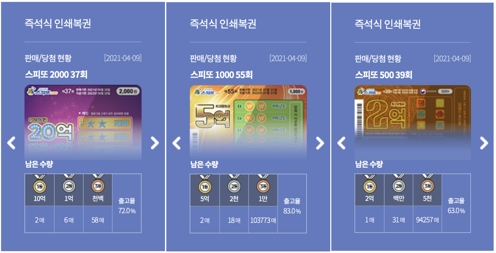 오히려 스피또 2000보다 출고율은 높고 1등이 2장이 남아있는 상태이니 스피또 1000을 구매해보시기 바랍니다.