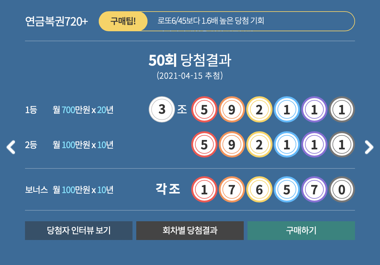 연금복권 제 50회 당첨결과 1등은 제 3조 592111번이고 2등은 각조의 582111번입니다.