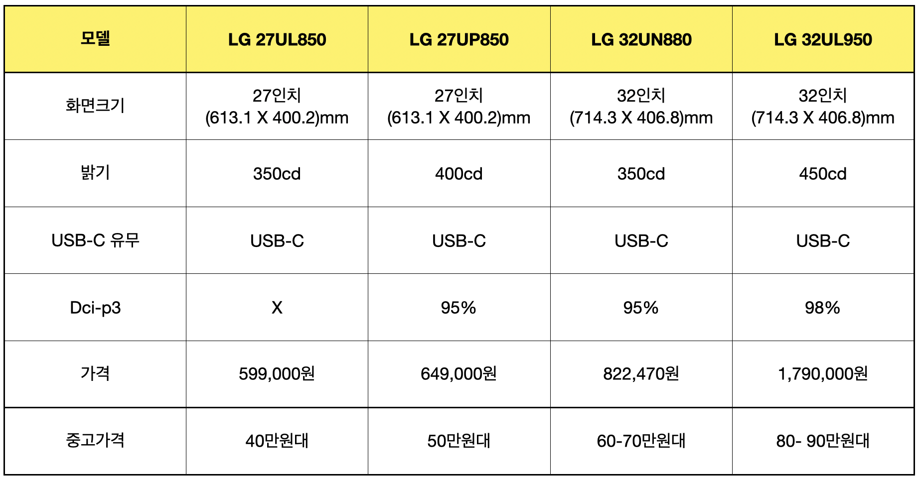 그렇게 나의 선택지에 들어오게된 모니터가 LG 모니터 4종입니다.