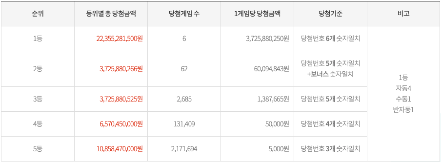 의외로 잘 나오지 않는 당첨구조였는지 1등 당첨자가 많지 않았습니다.