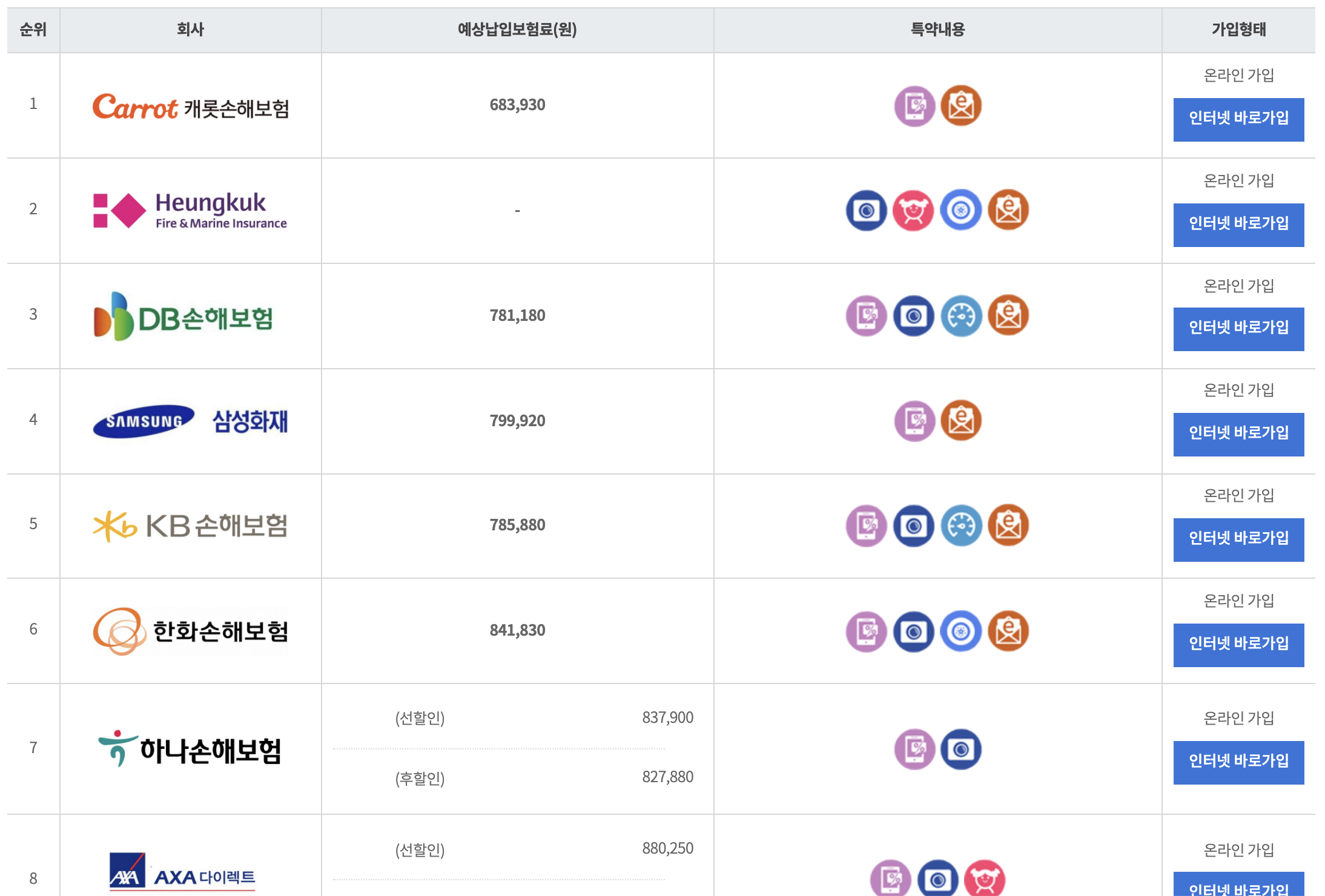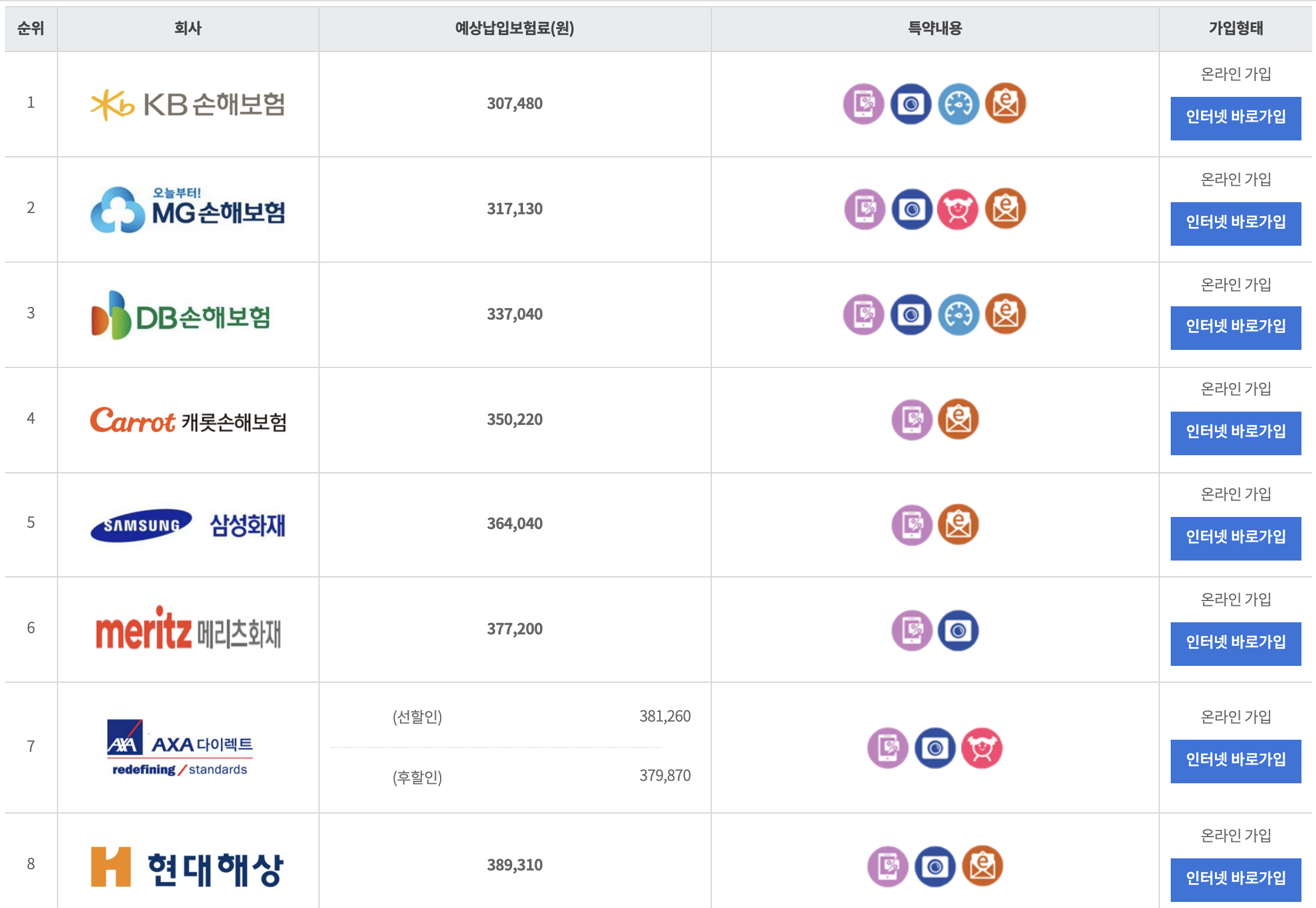 두번째로 AXA 자동차보험, 세번째가 KB 자동차보험입니다.