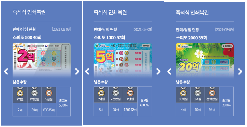 현재 출고율이 100%인 스피또 2000과 스피또 1000복권은