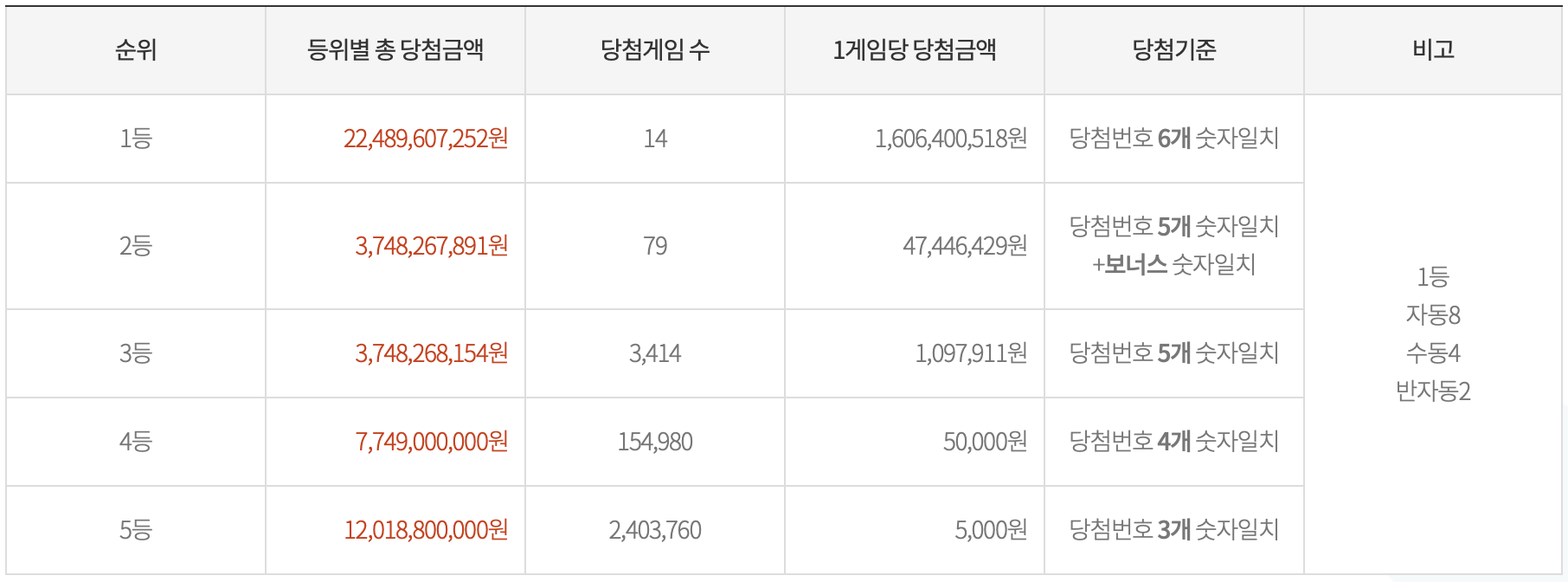1등 당첨자수는 총 14명으로 자동이 8명, 수동이 4명, 반자동이 2명 당첨되었습니다.