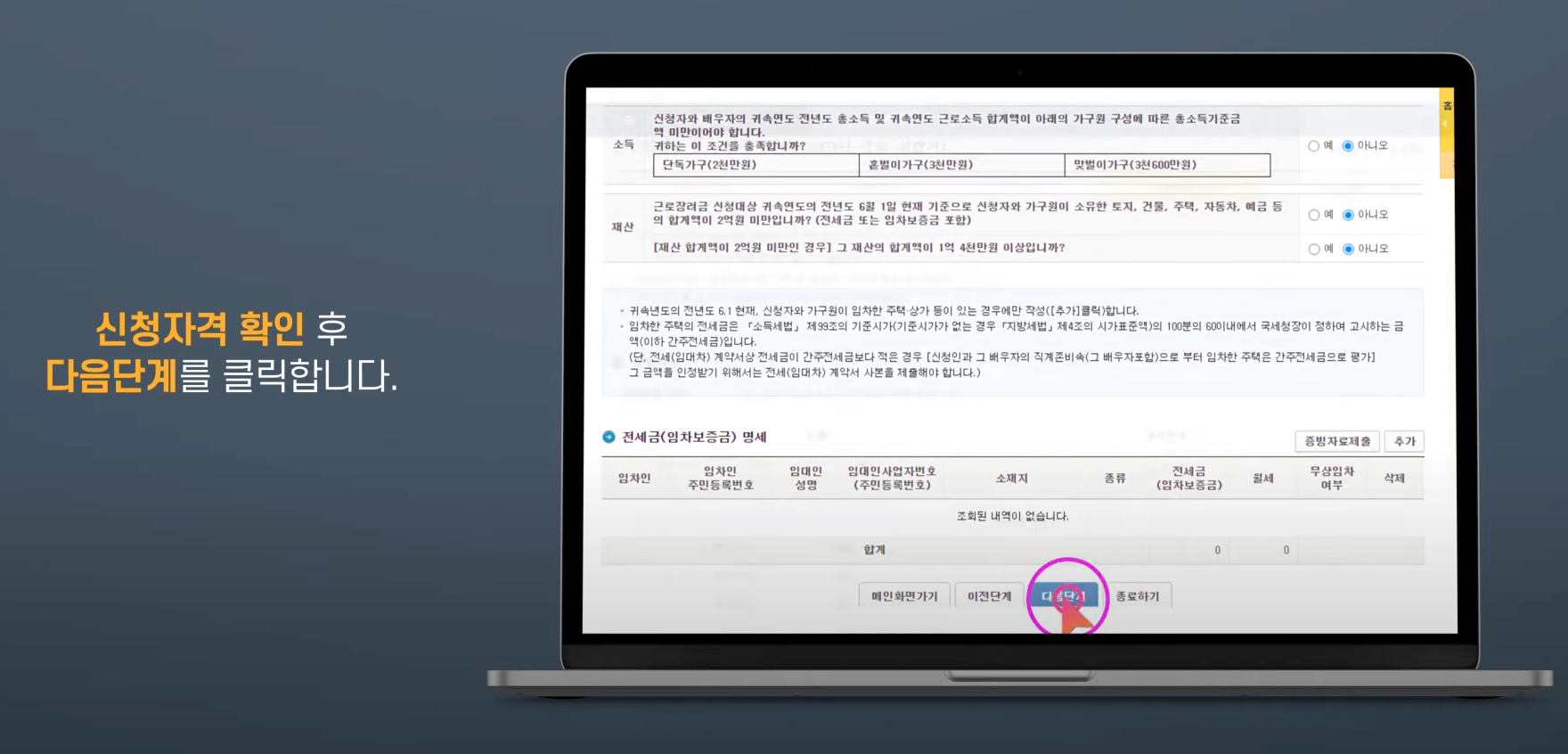 아. 신청자격 확인 후 다음단계를 클릭합니다.