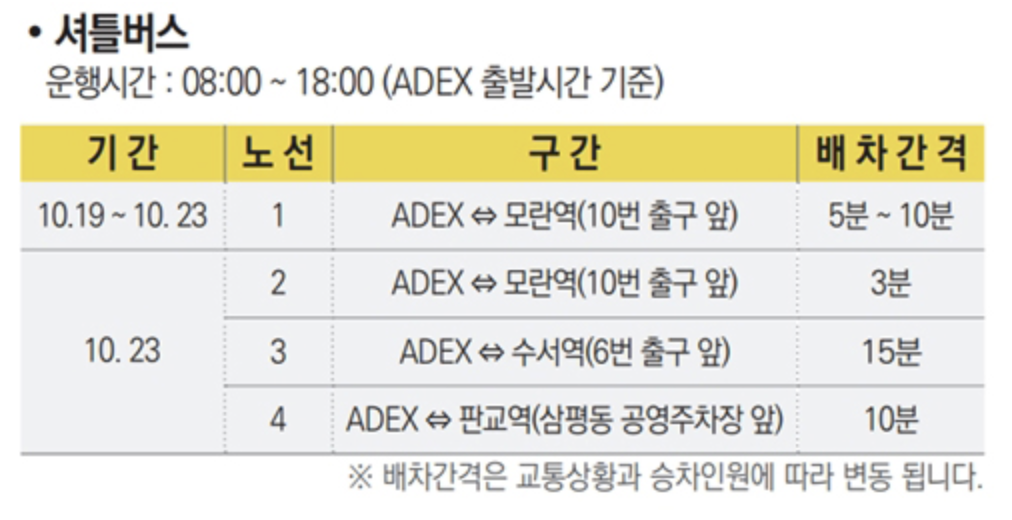 19일부터 22일까지 모란역 10번출구에서 행사장까지 5분~10분 간격으로 운행하고