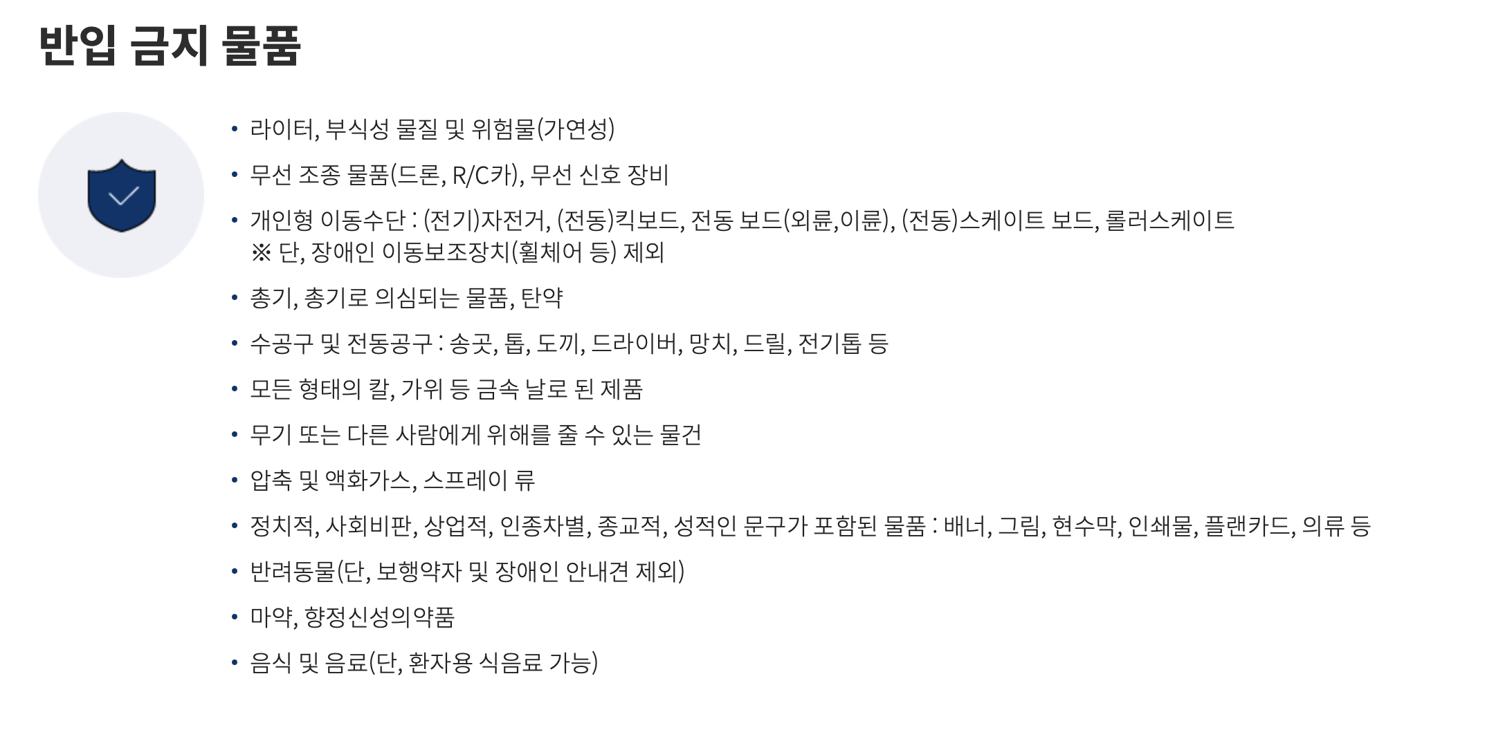 이때 반입금지 물품이 있다면 출입이 제한되니 혹시 이런 물품이 없는지 확인하셔야 합니다.