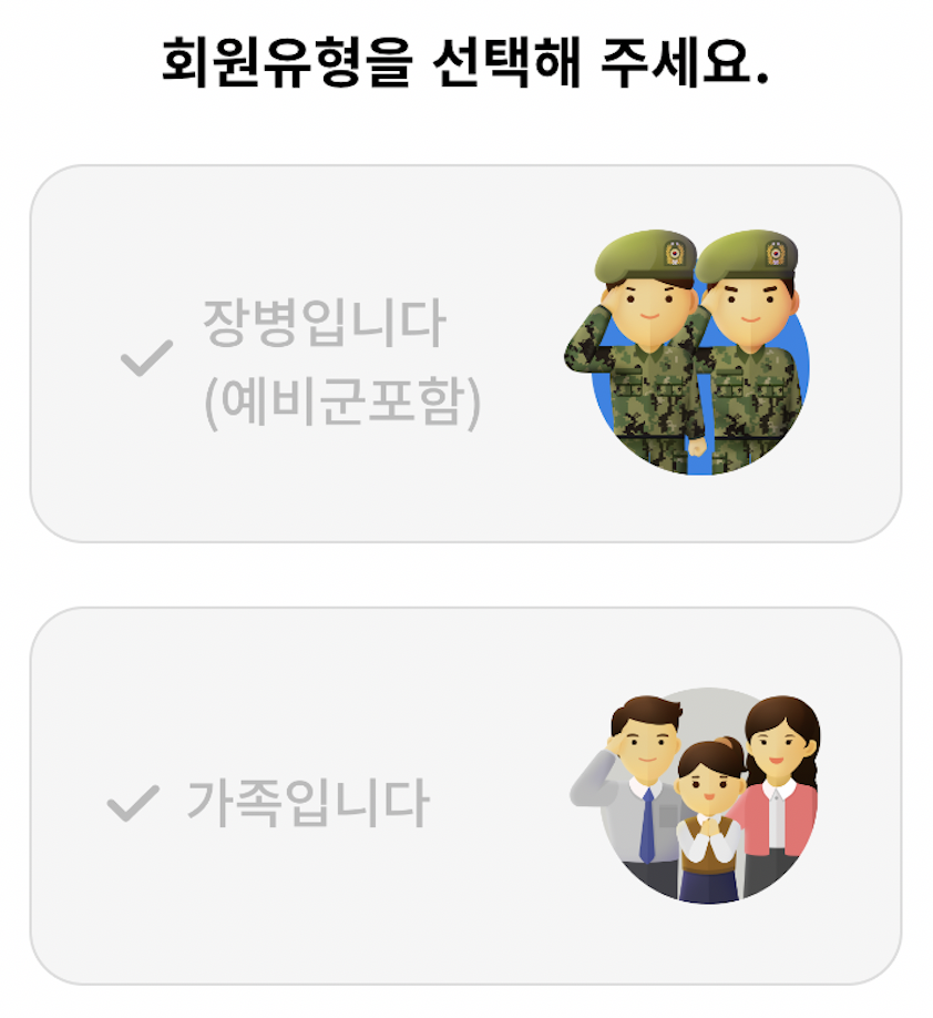 장병인지, 가족인지 선택한 후 개인정보를 입력하면 회원으로 등록이 가능합니다.