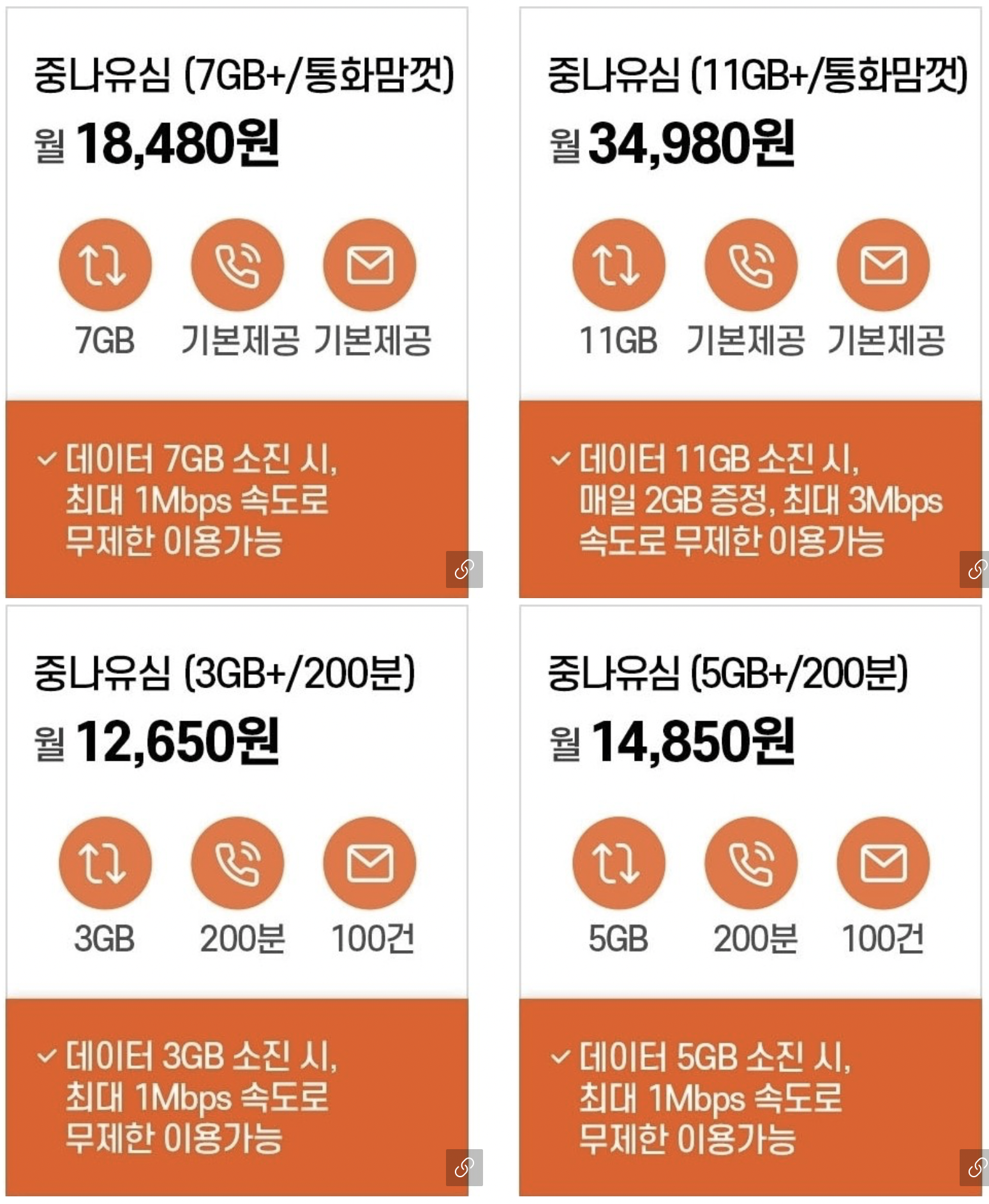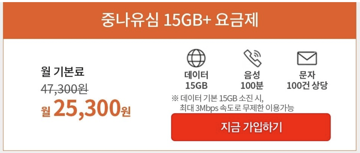 세븐 모바일의 중나유심 15G+ 요금제는