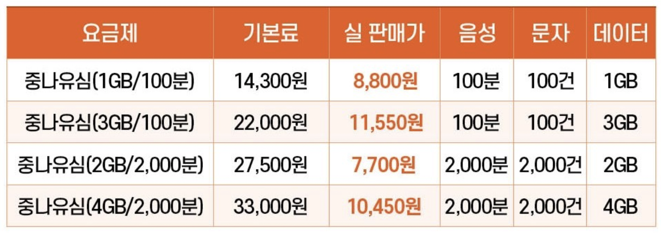7,700원 중나유심 요금제에 가입했습니다.