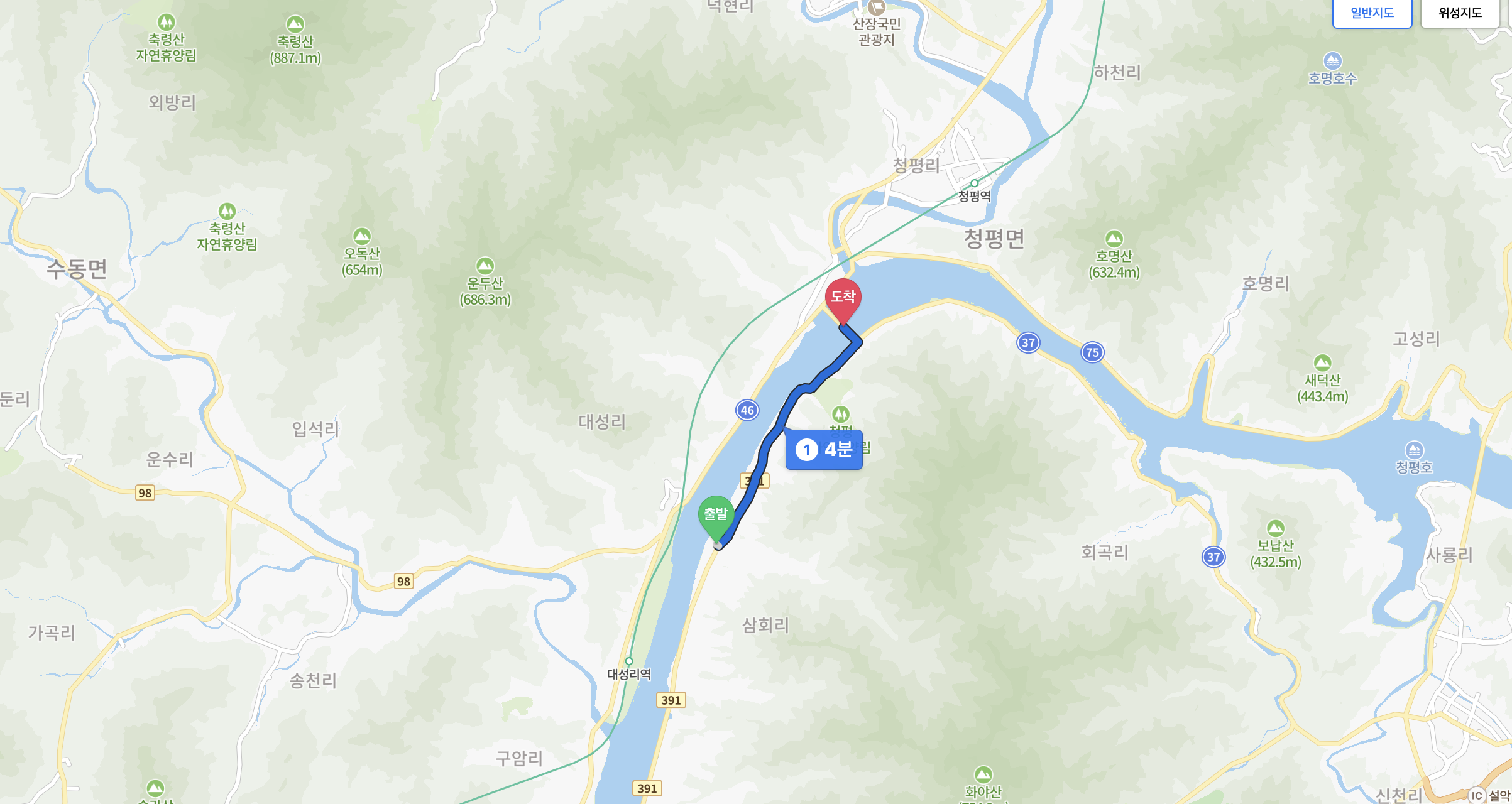 대성리역 맞은편 길 391번국도를 따라 청평호까지 이어지는 길이죠