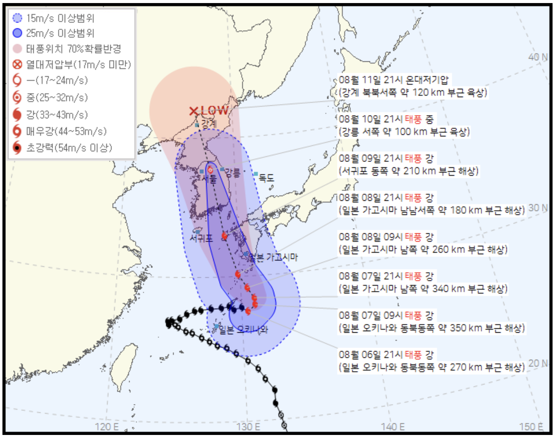 이후 갑자기 경로를 틀어 동진하다가 8월 6일 21시에 오키나와 동북동쪽 약 270 km 해상을 지나면서 중심기압 970hPa, 최대풍속 35m/s, 강풍 반경 350km의 강한 태풍으로 한반도에 접근하게 됩니다.