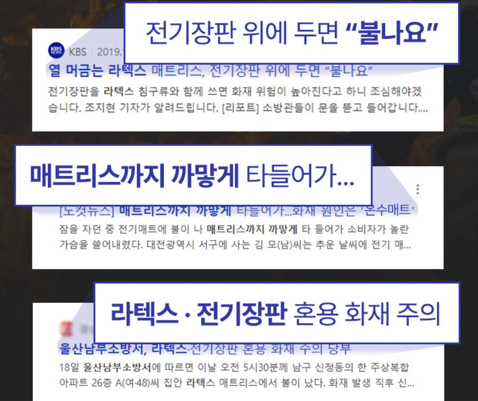 일반 전기매트나 온수매트의 경우 계속되는 열로 인해 라텍스나 메모리폼과 같이 사용한다면 열축적이 되어 화재로 이어지게 됩니다.