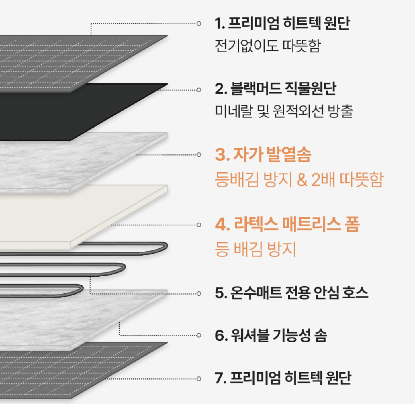 품쏙 매트의 레이어 설계에서는 모두 7중구조로 만들어졌으며 라텍스 폼과 도톰한 자가 발열섬을 더해 온수호스가 느껴지지 않도록 하고 있습니다.