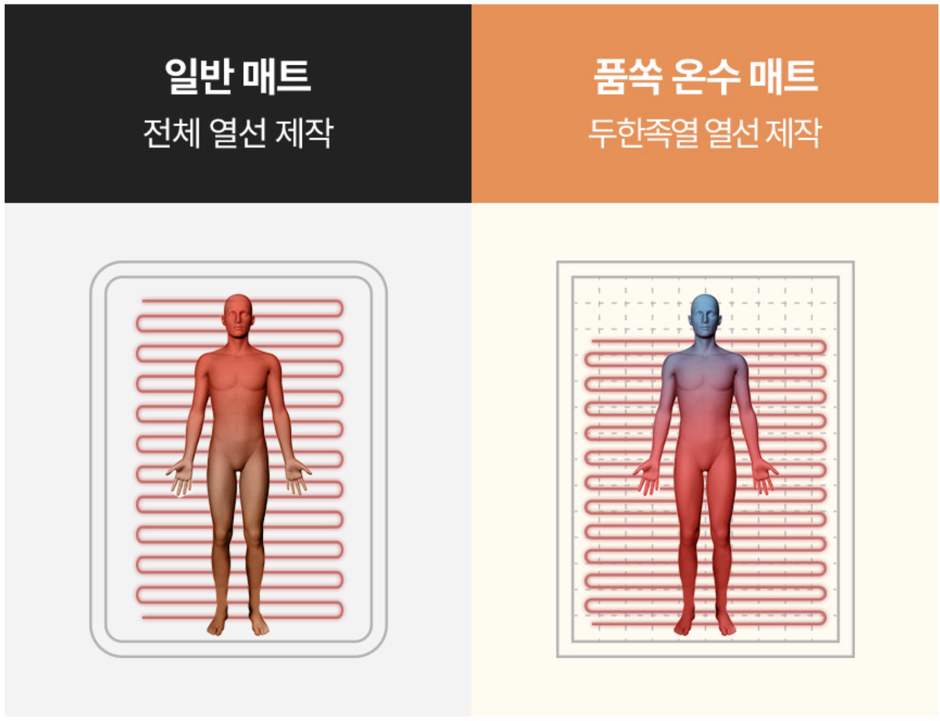일반 전기매트나 온수매트의 경우 매트 전체에 열선이 뻗어 있지만 이 품쏙 온수매트는 두한족열에 따라 머리부분 30cm에는 열선을 넣지 않아 깊은 수면을 가능하게 합니다.