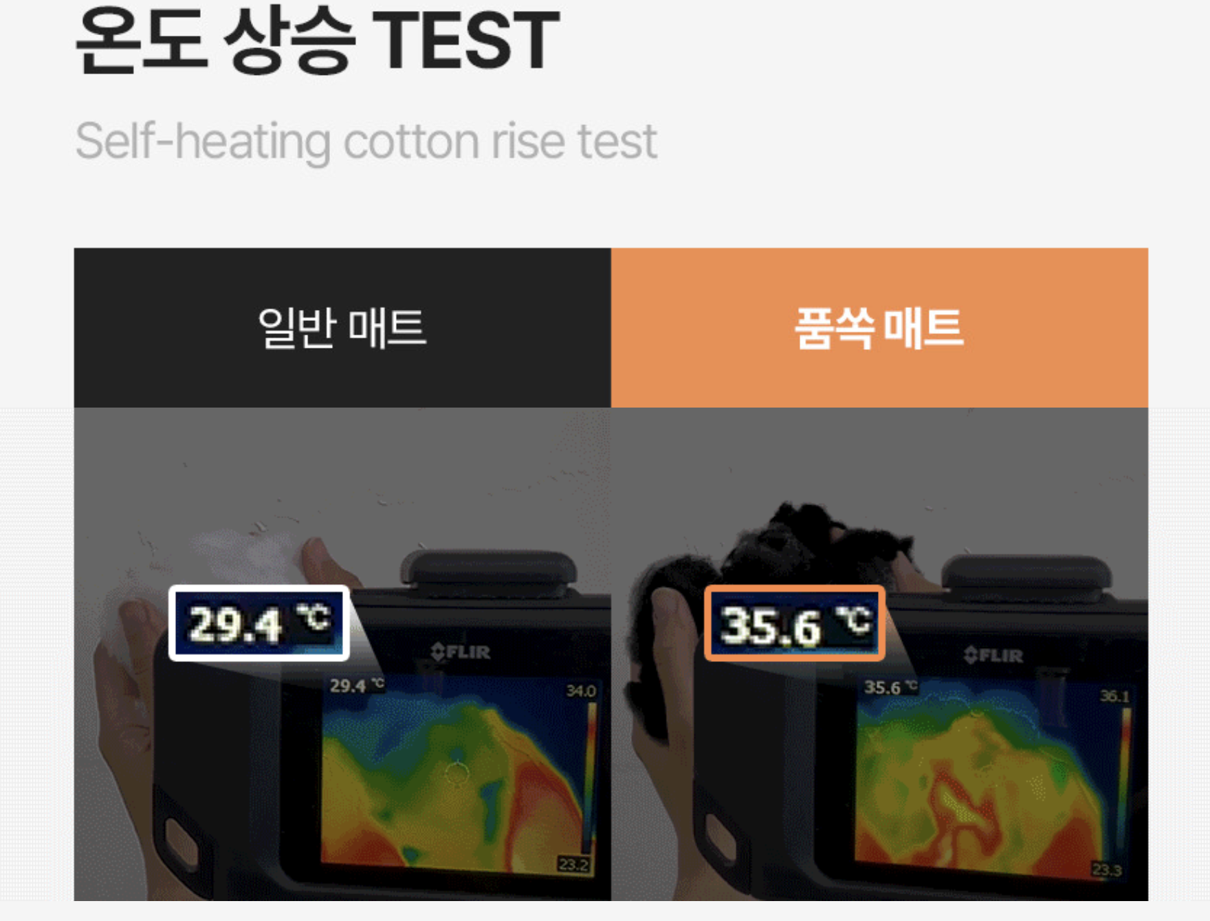 일반 온수매트와 품쏙 온수매트를 비교했을때 평균 6.23도 더 따뜻하다고 하네요.