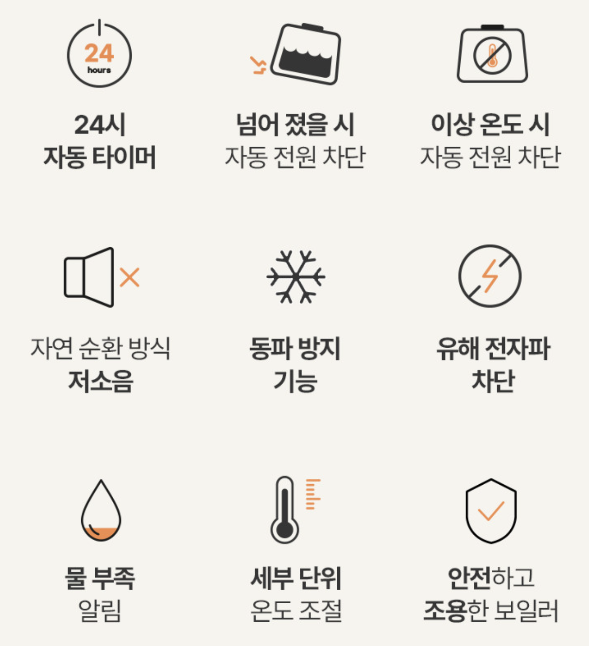24시간 후 자동으로 꺼지는 타이머와 넘어짐 방지 스위치 그리고 이상온도 시 자동으로 전원이 차단되는 이상온도 전원차단 장치도 설치가 되도록 하겠습니다.