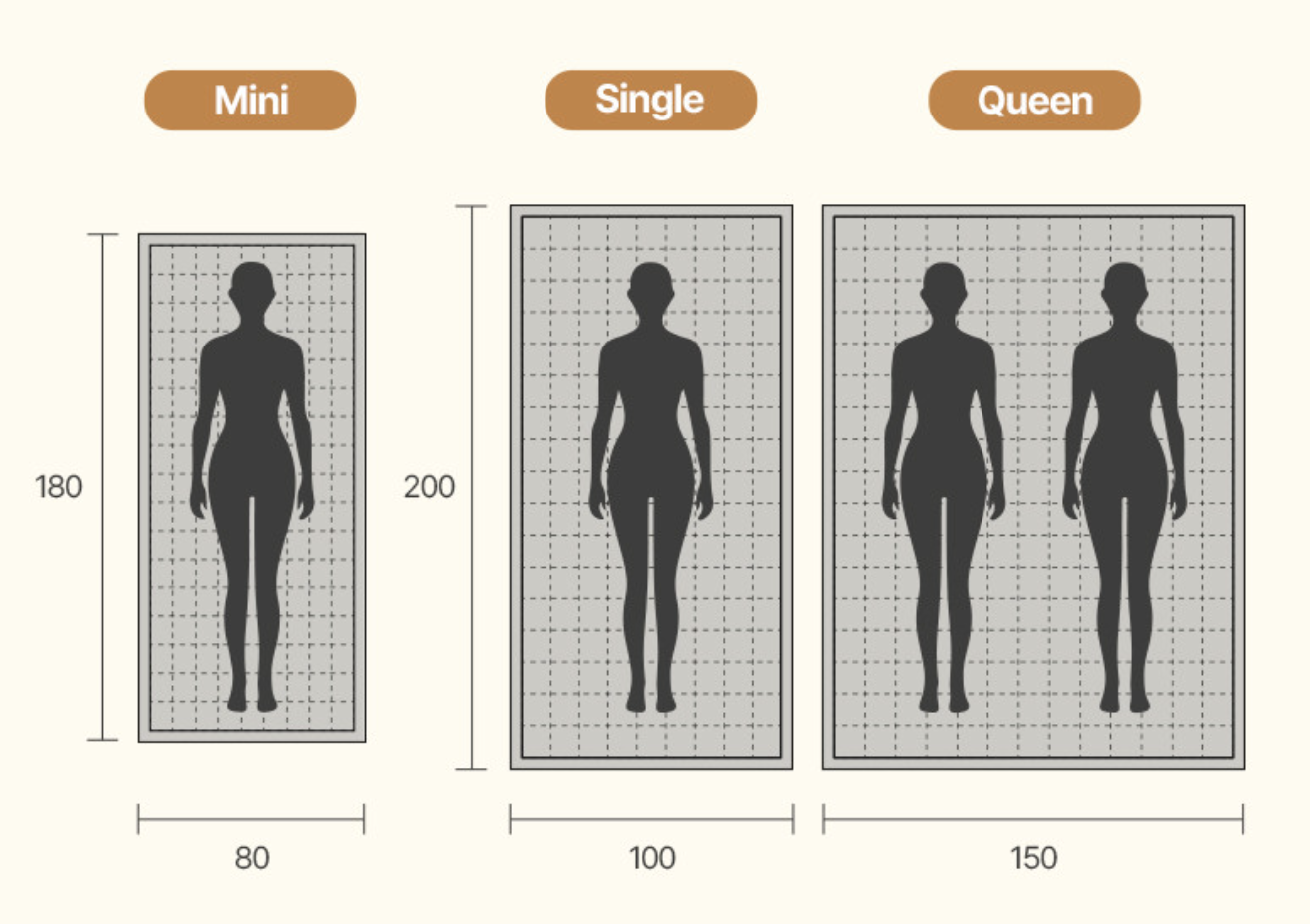 품쏙 온수매트는 미니, 싱글, 퀸 사이즈로 나오고 있습니다.