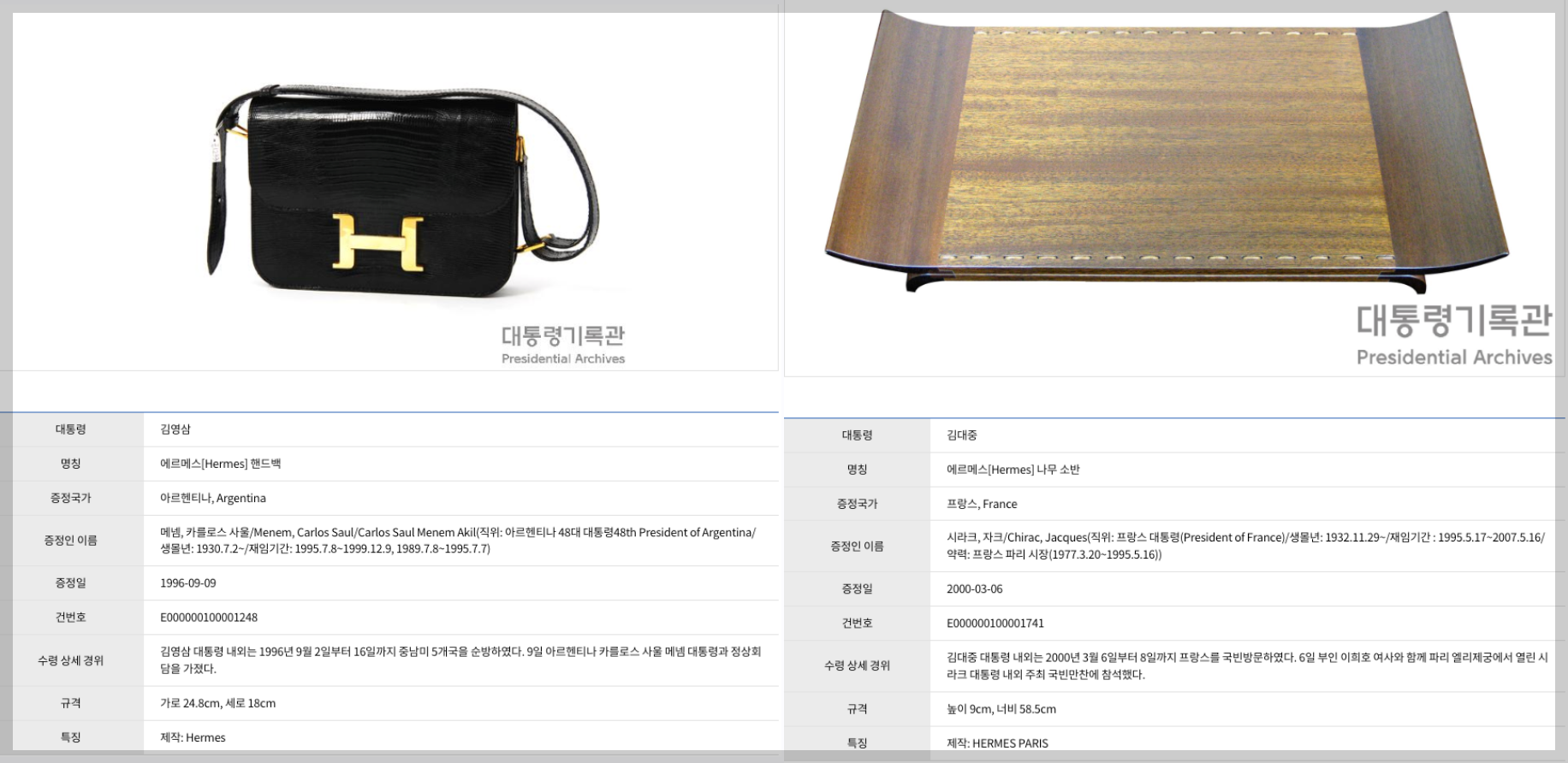 김영삼 대통령이 1996년 아르헨티나 대통령과 정상회담시 선물받은 에르메스 핸드백이 국가기록물로 지정이 되어 있었습니다.