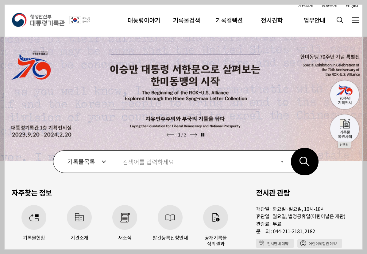 대통령기록관 홈페이지에서 상단메뉴 기록컬렉션 메뉴를 선택하면 다음과 같은 화면이 나옵니다.