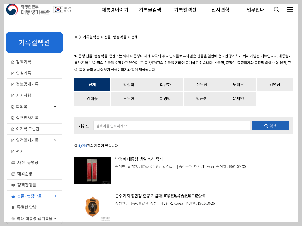 기록컬렉션 페이지에서 좌측 하단 메뉴에 선물,행정박물 메뉴가 나오는데 이를 선택하면 역대 대통령이 받은 선물이 모두 나오게 됩니다.