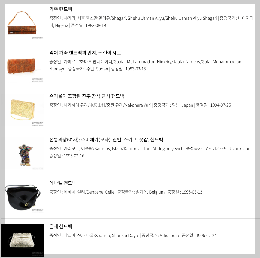 여기서 박정희 대통령부터 문재인 대통령 등 역대 대통령이 받은 선물중에 핸드백을 검색해보면 어떤 핸드백 선물을 받았는지 나오고 그 선물에 대한 이력이 보기 쉽게 나오게 됩니다.
