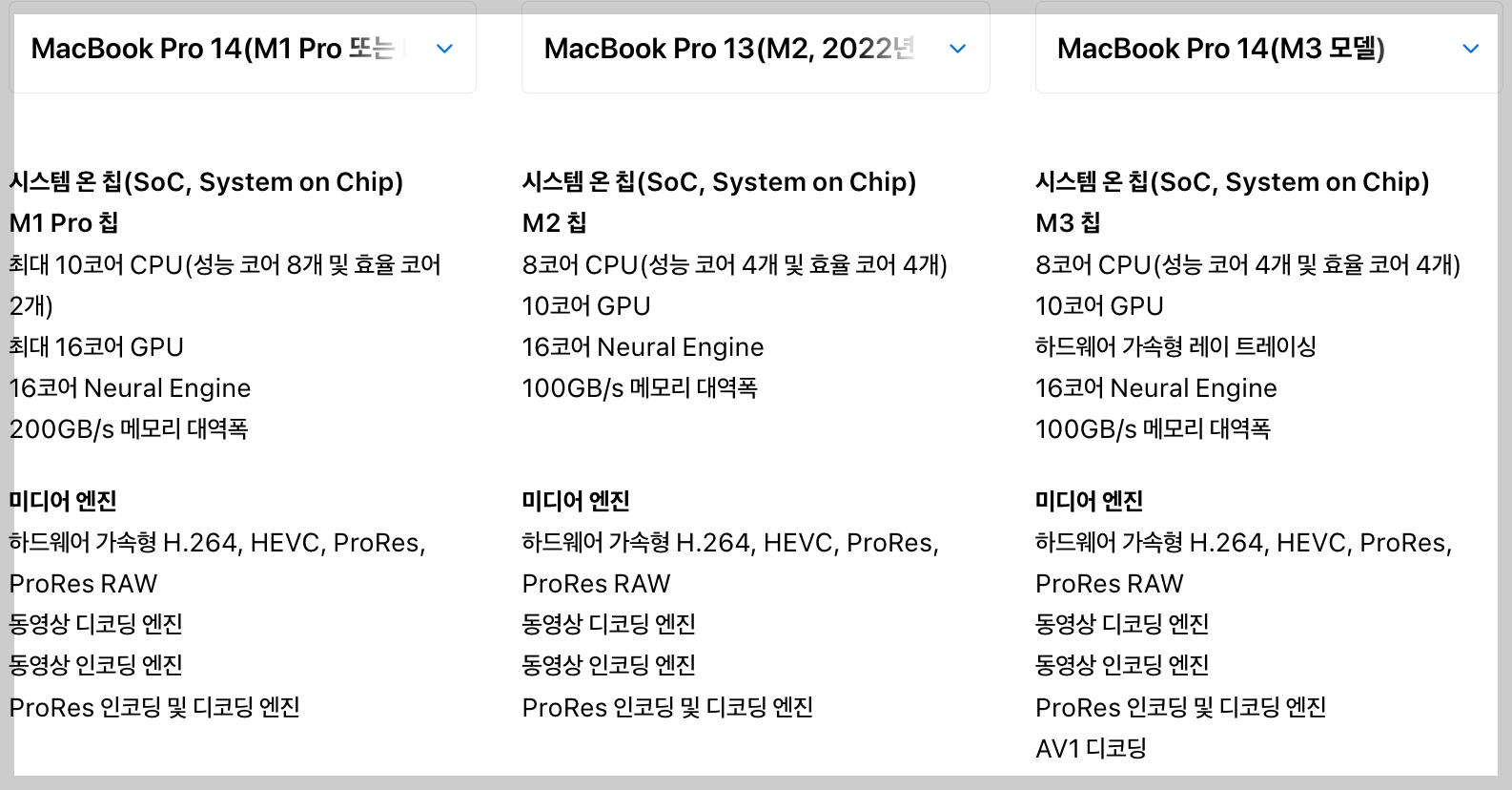 ■ 맥북프로 M1 과 맥북프로 M3 제원비교