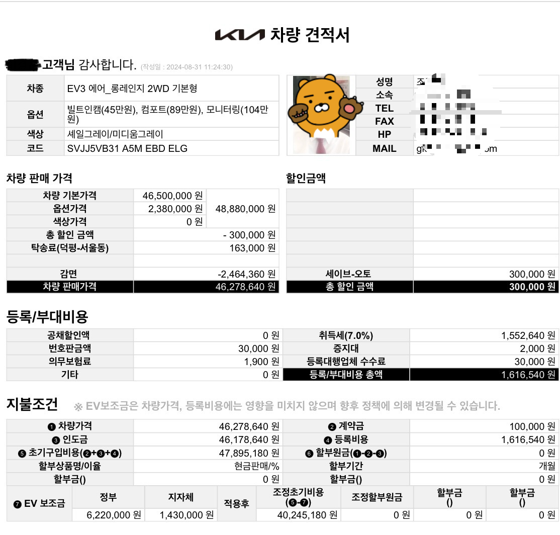 그럼 보조금을 빼면 40,876,480원이 등록비를 포함한 ev3 최종 구입가격입니다.