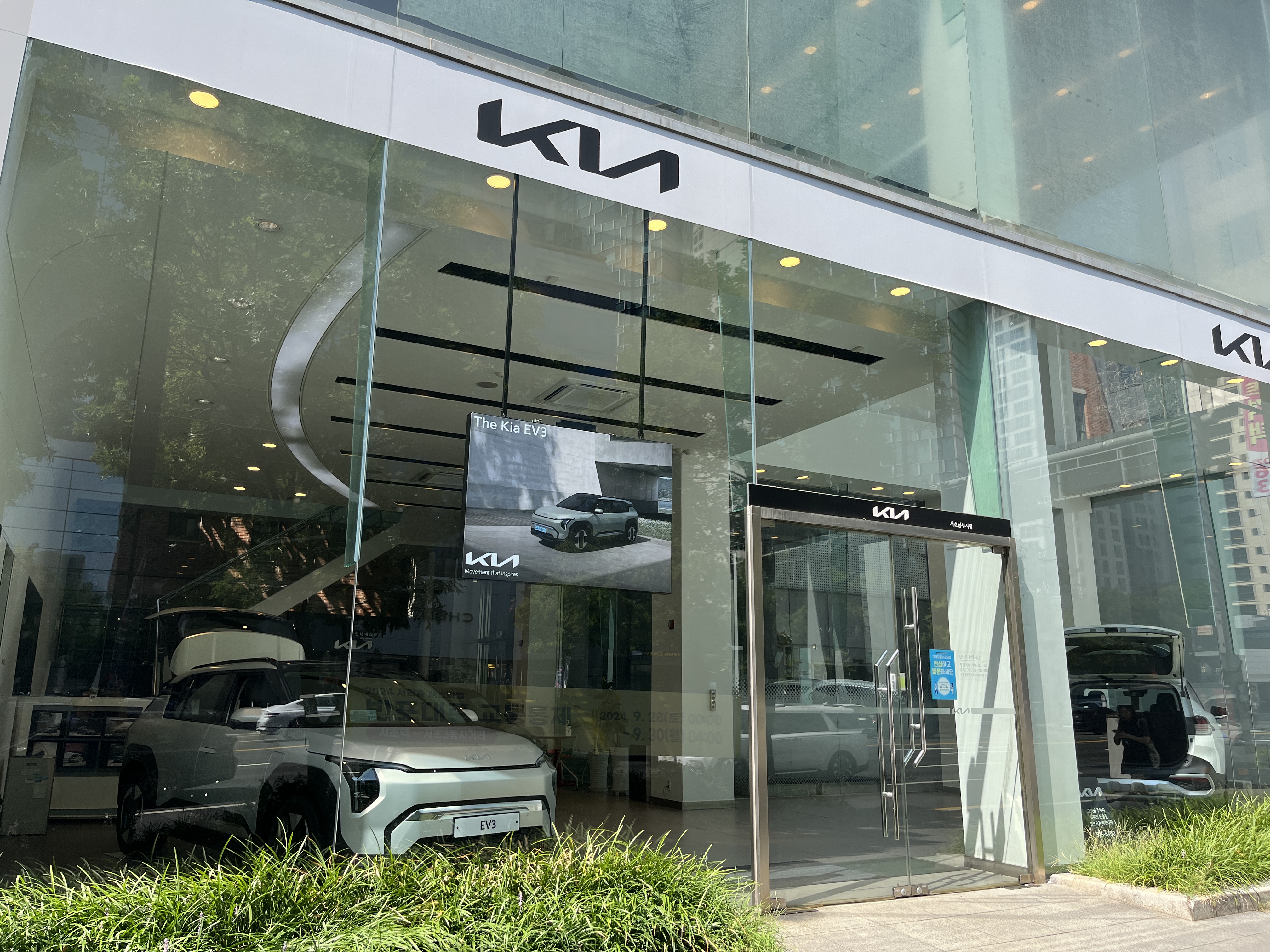 현재 EV3 전기차가 전시되어 있는 기아 서초남부전시장을 찾았습니다. 기아 EV3는 도심형 전기차로서 컴팩트한 크기와 모던한 디자인이 눈에 띄었습니다. 전면의 심플한 그릴과 세련된 라인은 전기차의 미래지향적인 이미지를 잘 반영하고 있으며, 기아 셀토스 차량과 비슷한 작은 차체에도 불구하고 전기차 플랫폼 E-GMP를 이용해 만들어 실내 공간이 넉넉하게 설계되어 일상적인 시내 주행은 물론, 가벼운 시외 나들이에도 충분해 보였습니다.