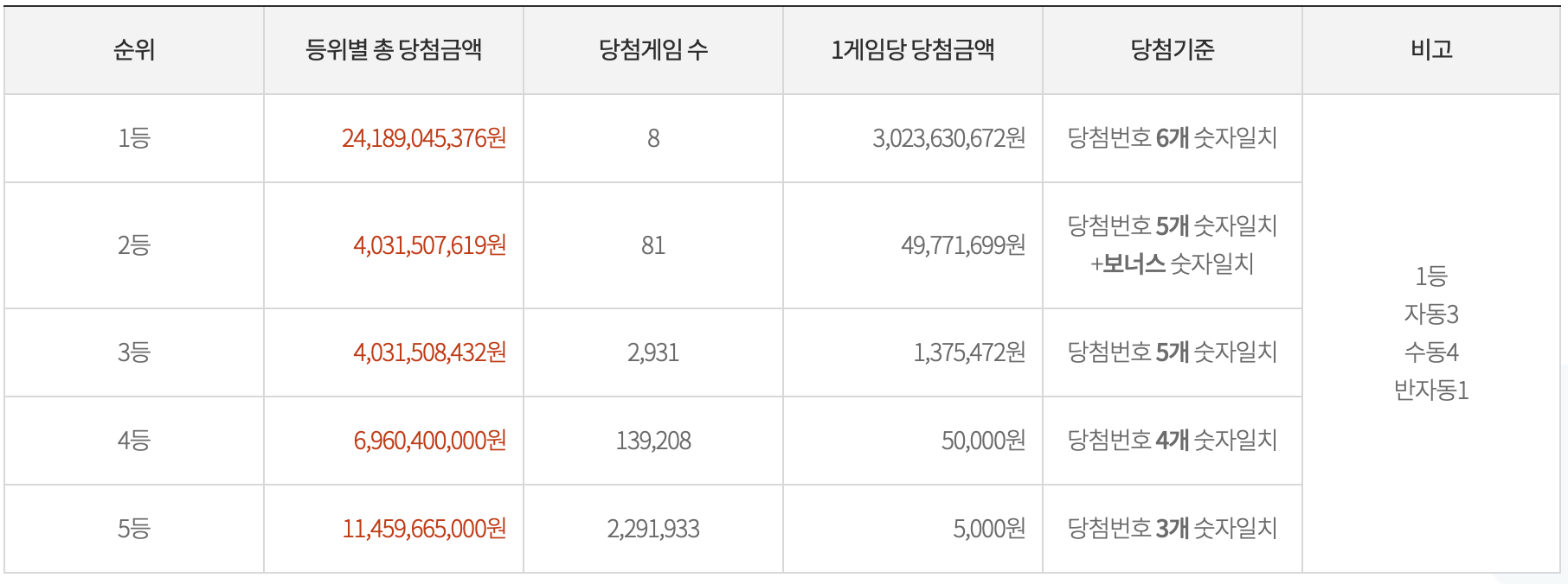 1등 당첨금액은 평균 당첨금액 20억원보다는 조금 높은 당첨금액입니다.