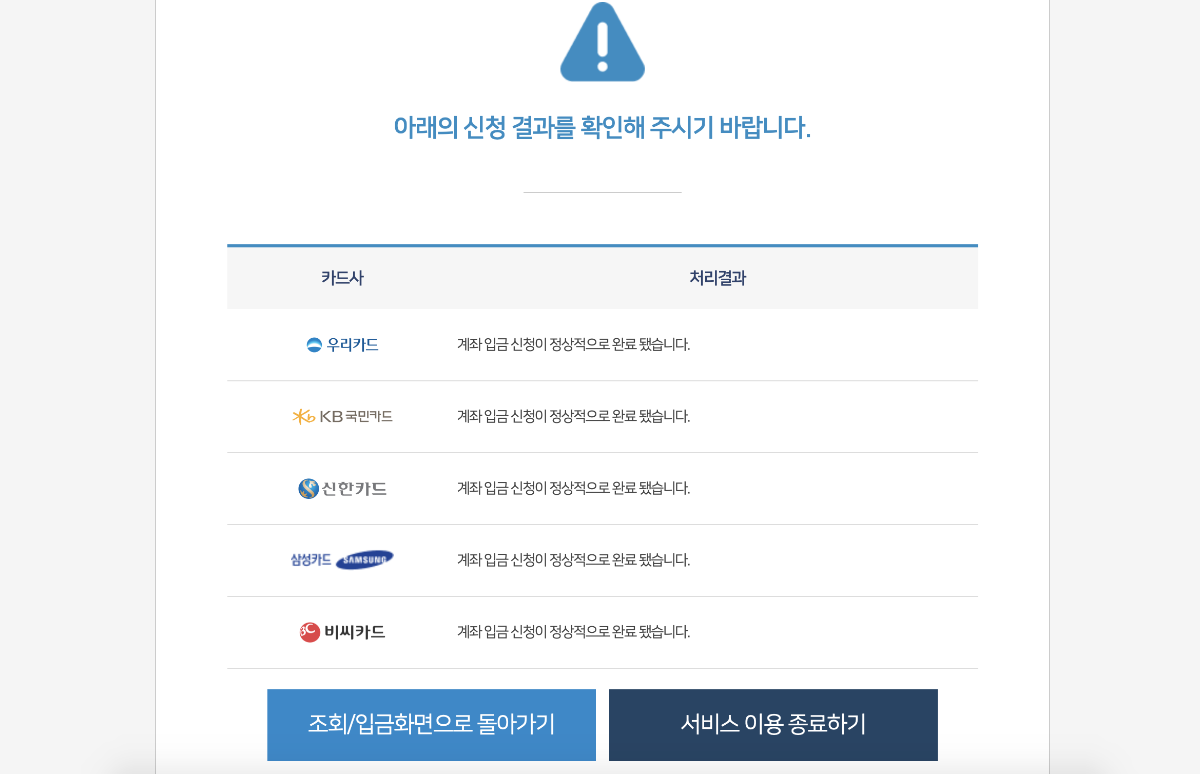 제가 금요일날 신청했는데 신한카드, 우리카드, KB카드는 바로 입금처리가 되었습니다.