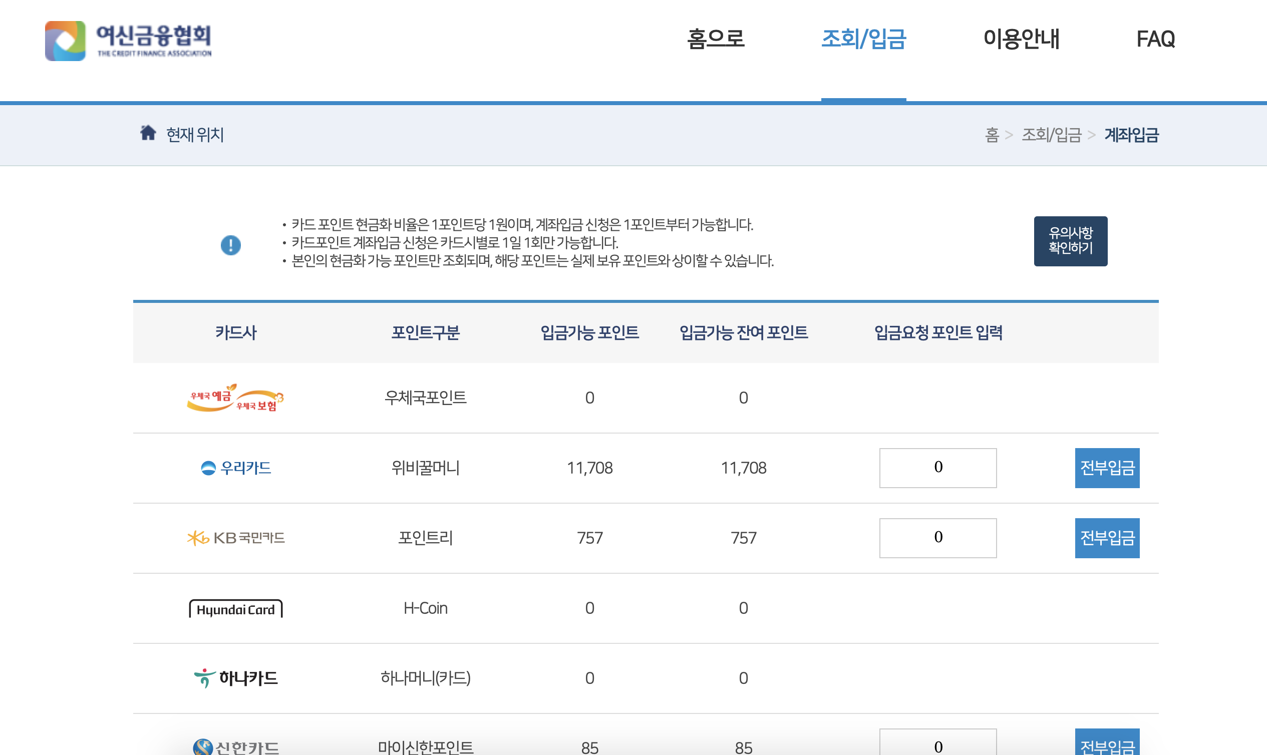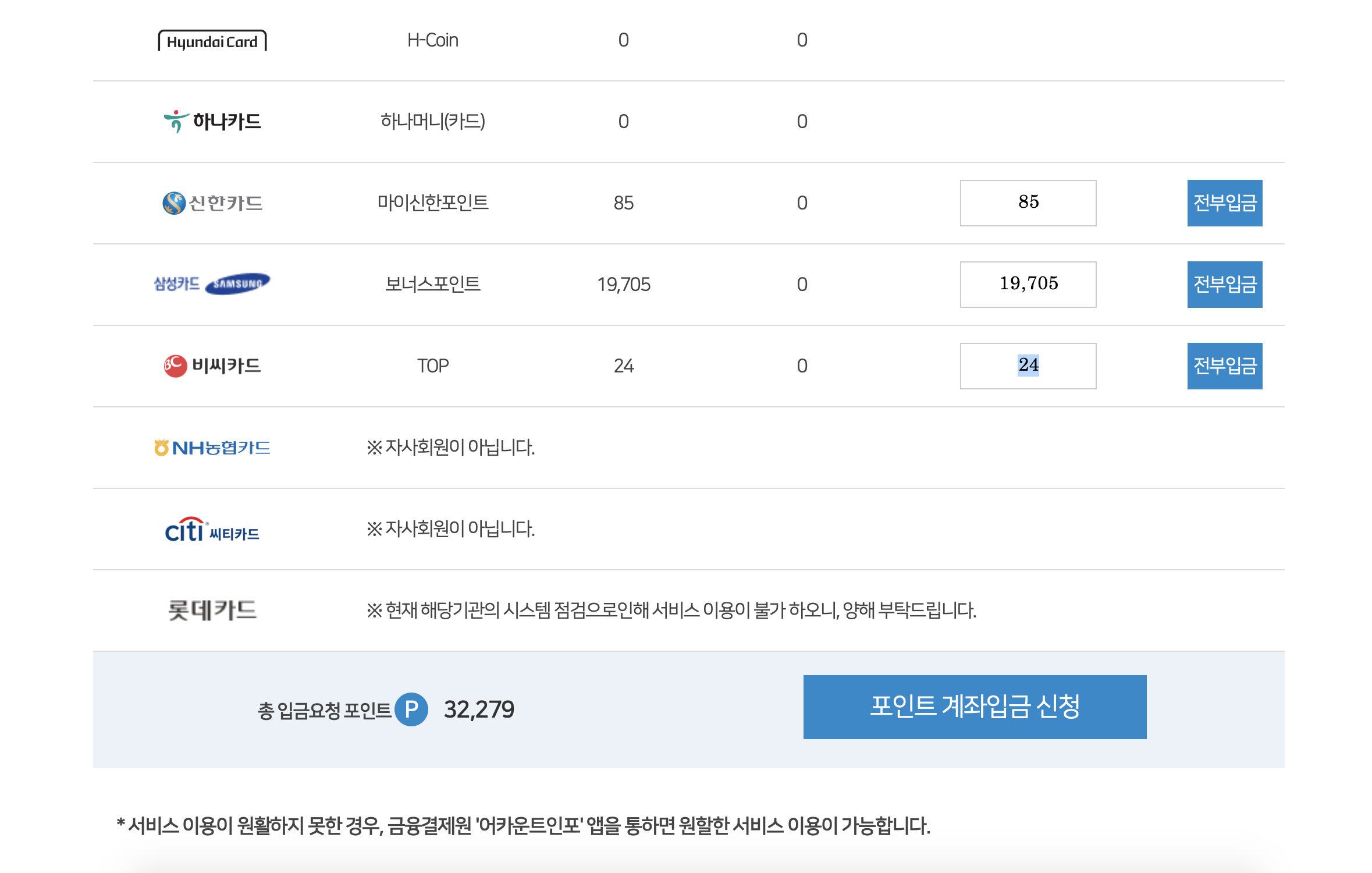 다음에 보여지는 카드회사만 포인트 조회후 입금이 됩니다.
