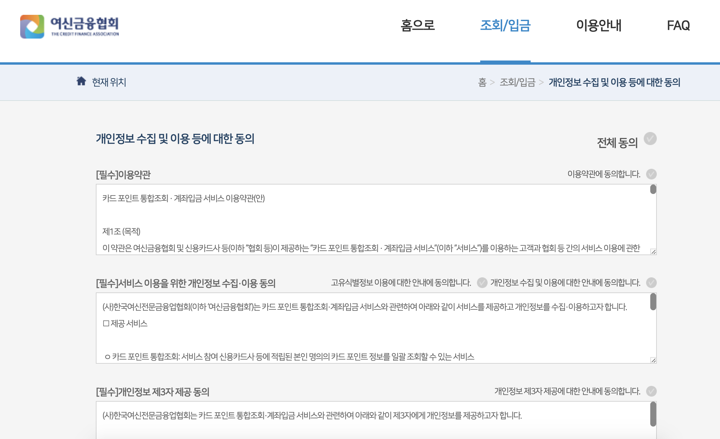 따라서 개인정보 수집에 대한 동의에 모두 클릭하셔야 합니다.