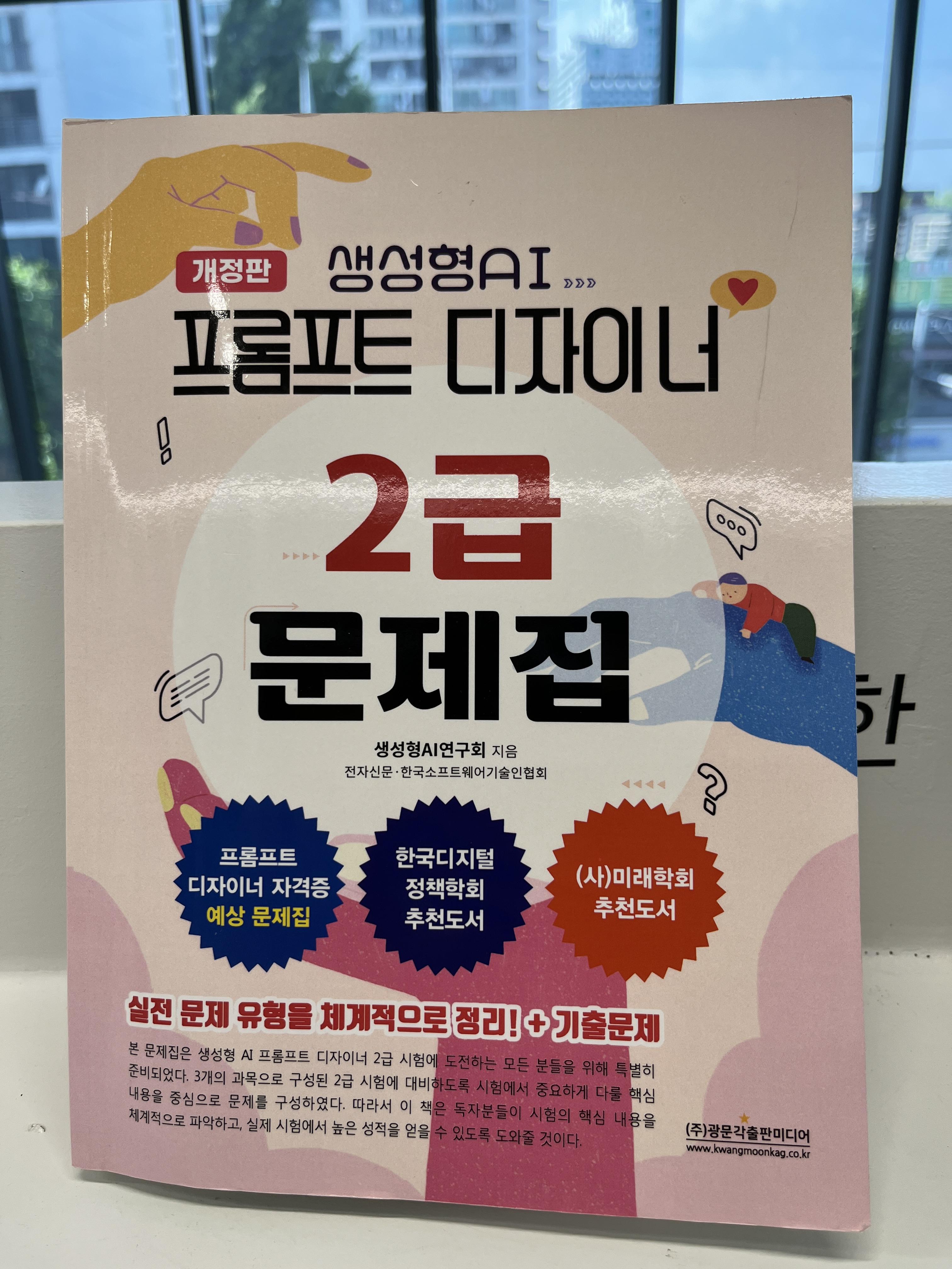 이번 시험 준비에 있어서 가장 중요한 도구는 '생성형 AI 프롬프트 디자이너 2급 문제집'이었습니다. 이 책은 광문각출판미디어에서 출판한 책으로 실제 시험 문제와 유사한 문제들로 구성되어 있어 매우 유용했습니다. 사실 기본 백그라운드 지식이 있고 문제집을 한번 풀어보면서 새로운 내용만 정리해서 본다면 실제 시험도 무난히 풀수가 있습니다. 사실 시험 내용이 상식적인 수준에서 풀어도 50% 이상은 맞출수 있게 문제가 나옵니다. 아직은 자격증이 대중화가 안되서 쉽게 나온느거라고 생각듭니다. 원래 자격증이 처음 시작될때는 많은 사람들이 취득할수 있도록 풀어주는 입장이라서 그런지 문제지에 나오는 시험문제는 그리 어려운편은 아닙니다. 문제집을 풀면서 다양한 유형의 문제를 접하고, 이를 통해 실전 감각을 익힐 수 있었습니다. 약 1주일 동안 매일 시간을 내어 문제를 풀고, 틀린 문제는 내용을 정리해서 시험 당일날 한번정도만 더 훓어보아습니다.