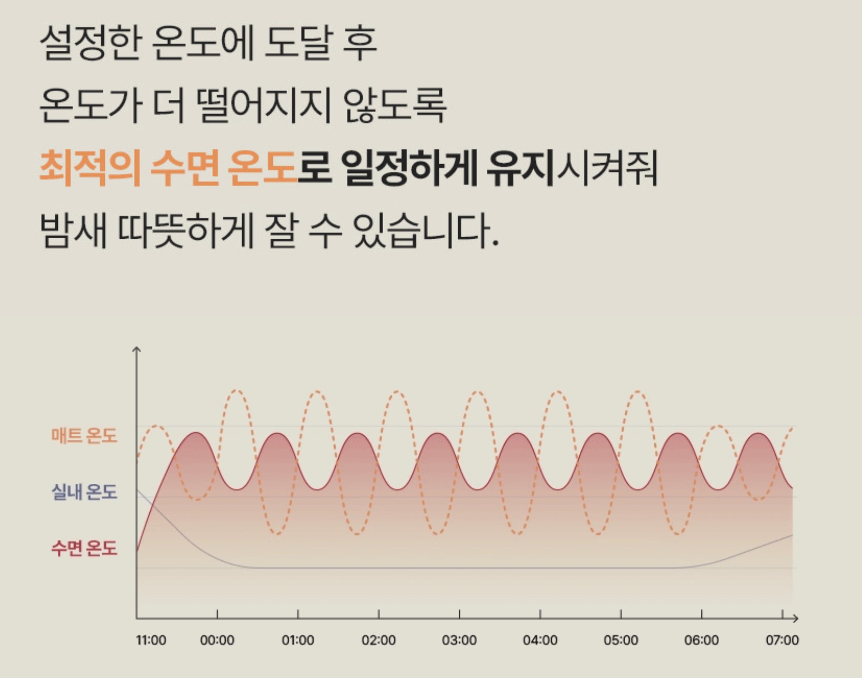 그래서 설정한 온도에 도달 후 온도가 더 떨어지지 않도록 최적의 수면 온도를 일정하게 유지시켜 줄수 있고 밤새 따뜻하게 잘 수 있습니다.