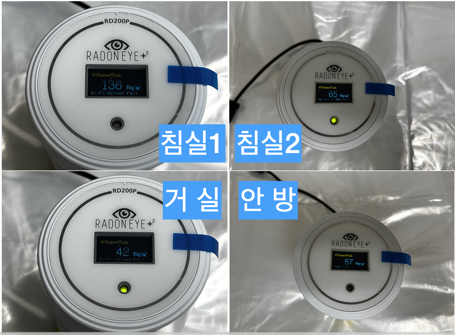 모든 방에서 환기 전/후 측정결과 기준치인 148㏃/㎥ 을 넘진 않았습니다. 다만 모든 방을 밀폐한 시간이 6시간 정도여서 만일 24시간 이상 밀폐되었다면 기준치를 넘길수도 있을것 같습니다.
