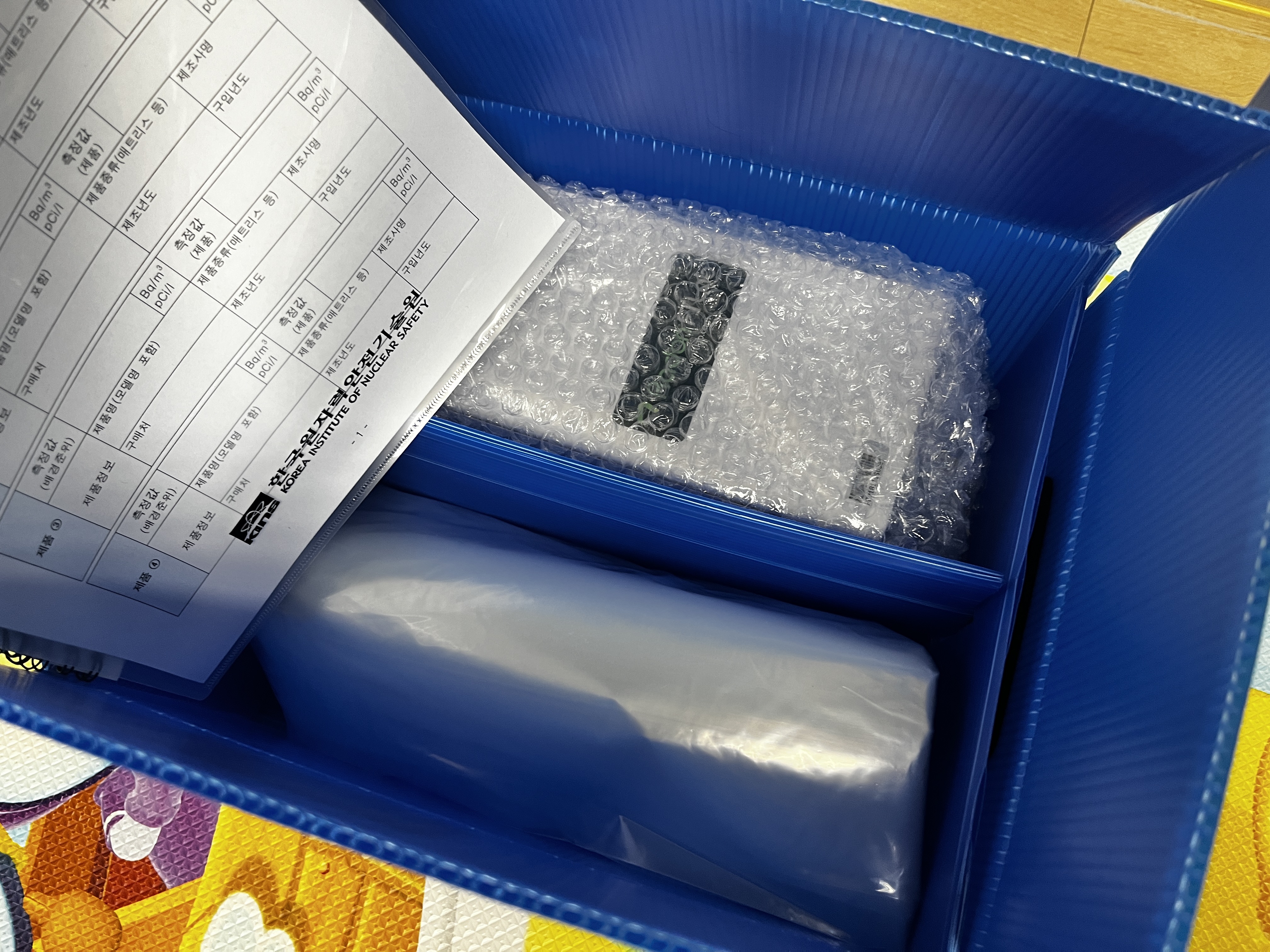 이렇게 분설결과서와 책자, 그리고 측정장비와 바닥에 깔고 측정하는 비닐을 잘 접어서 보내주신 플라스틱 박스 안에 잘 넣어서 포장해주시면 됩니다.