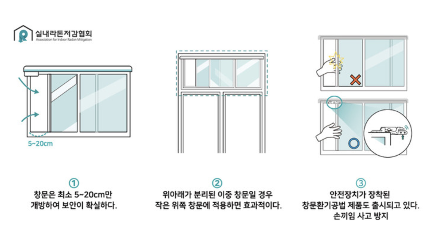 또한 지속적으로 라돈에 노출되는 경우 폐암을 유발하게 된다. WHO는 라돈을 흡연 다음으로 폐암 발병원인의 3~14% 차지한다고 보고하고 있으며, 일반적으로 같은 농도의 라돈에 노출된 경우 흡연자가 비흡연자에 비해 훨씬 폐암 발병확률이 높습니다. 하지만 라돈은 자연에서 오는 천연방사성핵종입니다 국토환경정보센터에 따르면 실내에 존재하는 라돈의 80~90%는 토양이나 지반의 암석에서 발생된 라돈 기체가 건물바닥이나 벽의 갈라진 틈을 통해 들어온다고 합니다. 그 외에도 건축자재에 들어있는 라듐 등으로부터 (2~5%) 발생하거나, 지하수에 녹아 있던 라돈이 실내로 유입(1%) 되기도 합니다. 라돈의 전체 인체 노출 경로 중 약 95%가 실내공기를 호흡할 때 노출되는 것이며, 이 밖에 라돈이 들어있는 지하수를 사용할 때 노출될 수 있습니다. 라돈의 유입을 막기 위해서는 우선 건물의 바닥과 벽의 균열을 보강해줘야하며 지속적인 환기를 해줘야 한다. 라돈은 무거운 기체이므로 환기할 때 현관문을 열고 환기해야 효과가 있습니다. 한 논문에 따르면 창문을 닫고 24시간 밀폐한 결과 연구 대상인 다섯 가구의 평균 라돈가스 농도가 120∼150Bq(베크렐)/㎥까지 치솟았습니다. 48시간 밀폐했을 때는 320Bq/㎥까지 상승하기도 했습니다. 하지만 창문과 방문을 모두 열어 외부의 신선한 공기가 유입되도록 하자 금세 30Bq/㎥ 이하로 떨어졌습니다. 이 논문에서는 하루에 2차례 5~10분 정도 실내 공기를 완전히 환기할 것을 제안했습니다