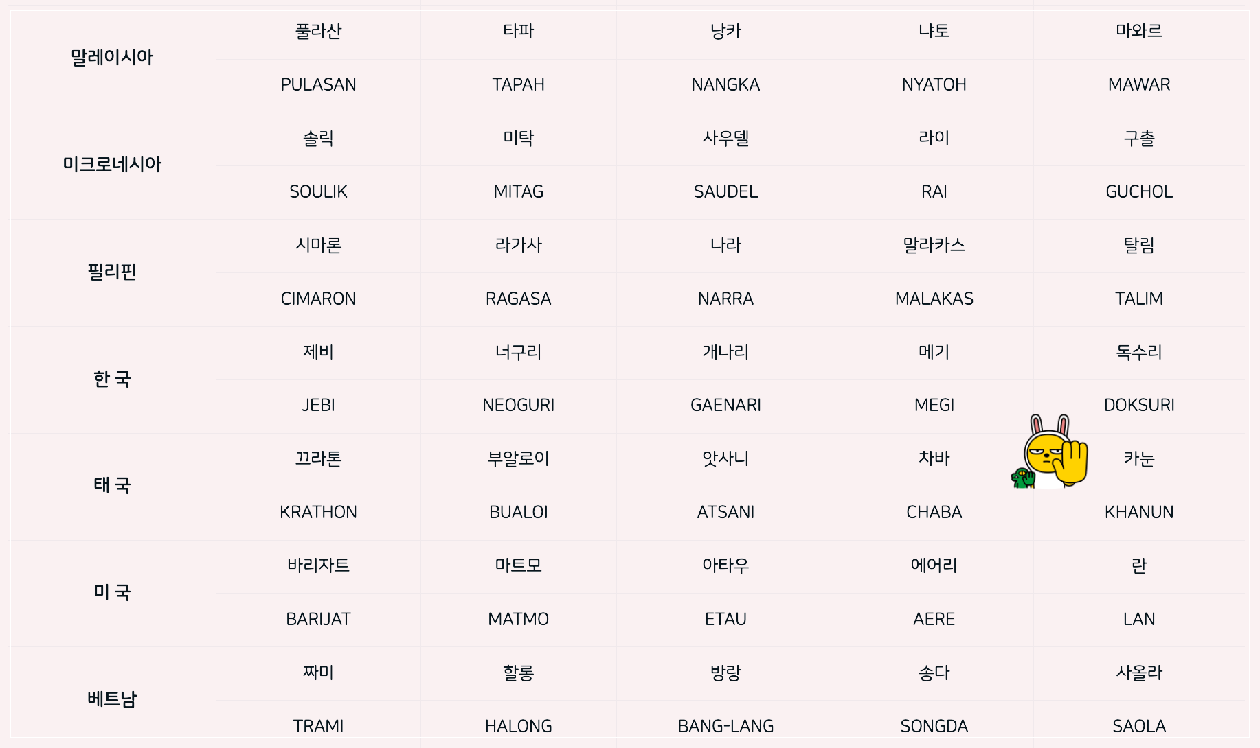 태풍 이름은 각 국가별로 10개씩 제출한 총 140개가 각 조 28개씩 5개조로 구성되고, 1조부터 5조까지 순차적으로 사용합니다. 140개를 모두 사용하고 나면 1번부터 다시 사용하는데요, 태풍이 보통 연간 약 25개 정도 발생하므로 전체의 이름이 다 사용되려면 약 4∼5년이 소요됩니다. 태풍위원회 회원국에는 북한도 포함되어 있어 한글로 된 태풍 이름은 총 20개입니다.