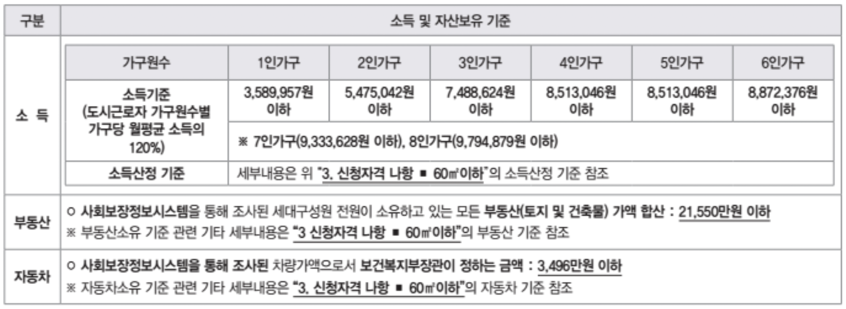 특히 소득과 자산 및 자동차 가액에 따라 청약자격이 될수도 있고 안될수도 있으니 반드시 확인하셔야 합니다.