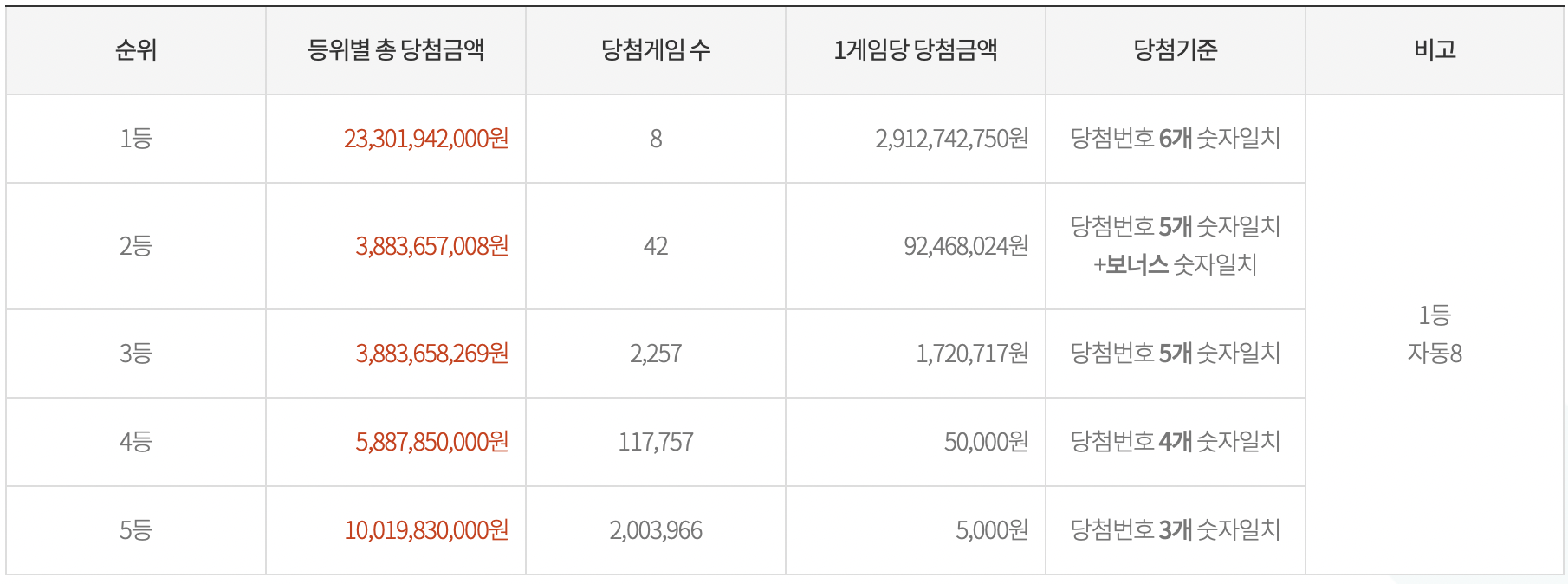 1등 당첨금액은 약 16억7천만원으로 당첨자가 14명이라 약간 당첨금액이 작습니다.