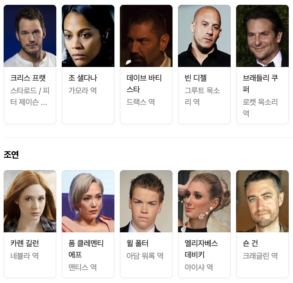 조연으로는 귀여운 맨티스의 카렌 길런, 사이버틱한 네뷸라 역의 카렌 길런 빨리 성장시켜 약간 모자란 아담 워록의 윌 폴터, 아이샤 역의 엘리자베스 데비키 그리고 크래글린 역의 숀건이 주연으로 나오게 됩니다. 그런데 여기서 이미 죽은걸로 나오는 가모라가 왜 여기서 나오지?? (약간의 반전이네요)