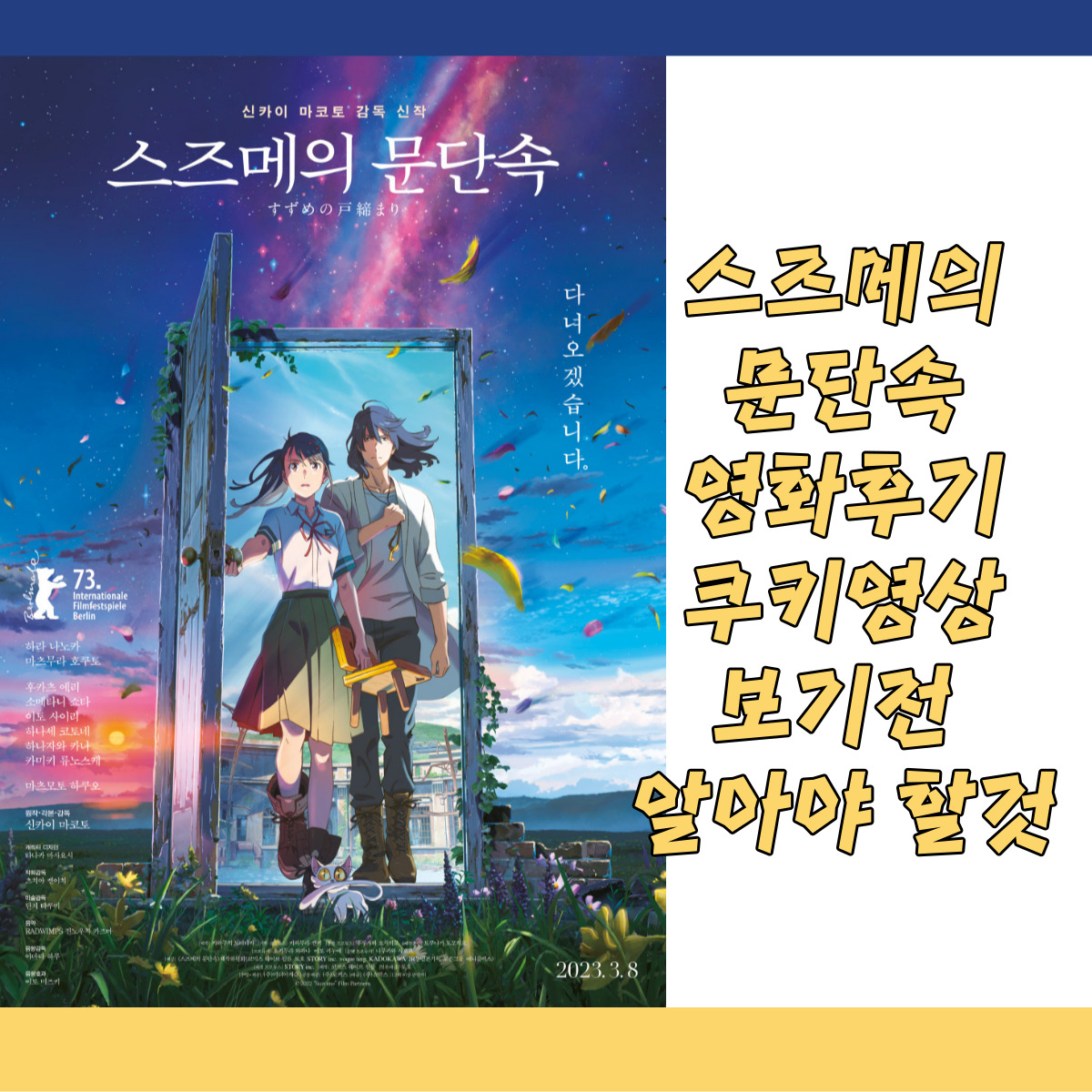 | 초등학생 자녀와 같이 본 스즈메의 문단속, 쿠키영상, OST, 영화후기 (0) | 2023.04.09 |