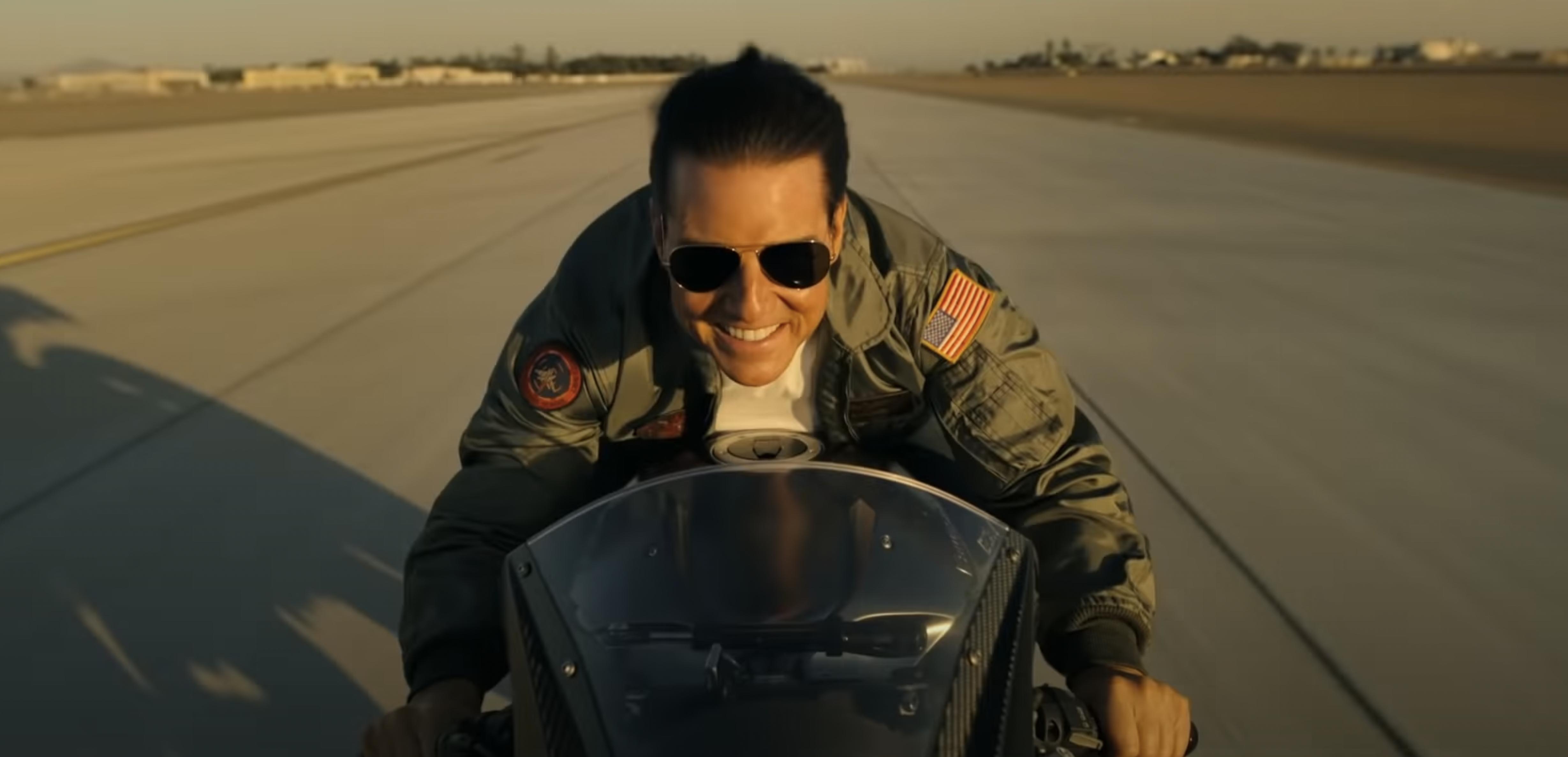 매버릭은 가와사키 오토바이를 타고 그 유명한 오토바이 장면을 연출하면서 비행장으로 떠납니다.